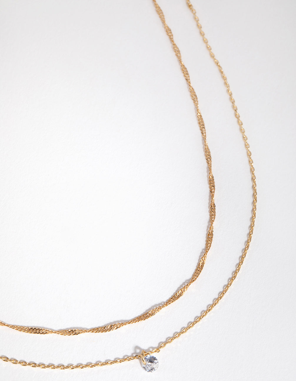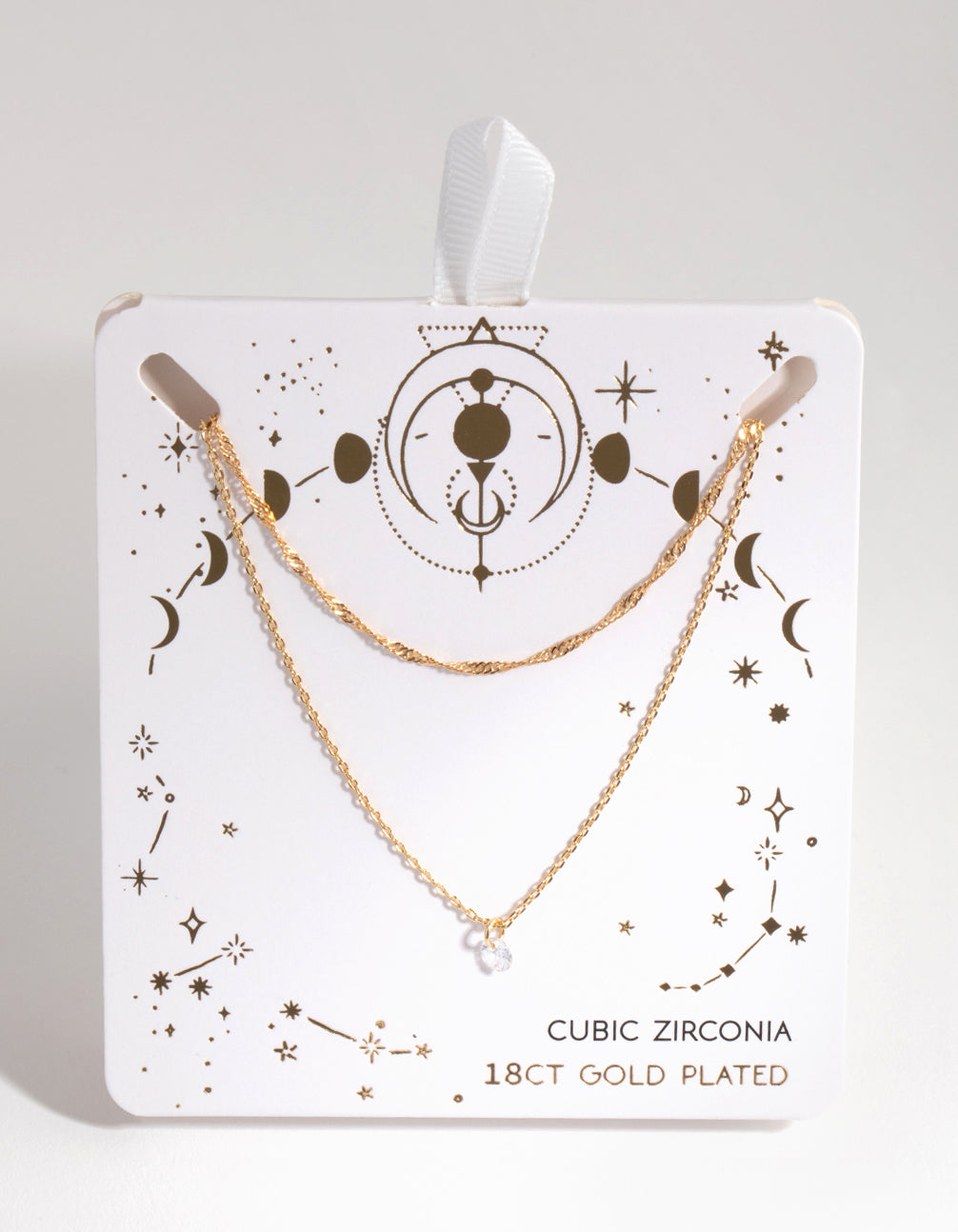 Be guided by the stars: a premium collection of thoughtful pieces that promote self-assurance and resilience through birthstones and the signs of the zodiac. This elegant necklace set is plated with genuine 18ct gold for authentic lustre and shine. It features two dainty chain necklaces. One boasts a Singapore chain and on the other a cubic zirconia gently rests on a fine cable chain. Cubic zirconia is indistinguishable from diamond to the naked eye. Diamond is the birthstone for the month of April, and it’s believed to promote purity and loyalty. Layer these lovely pieces together for daily inspiration.