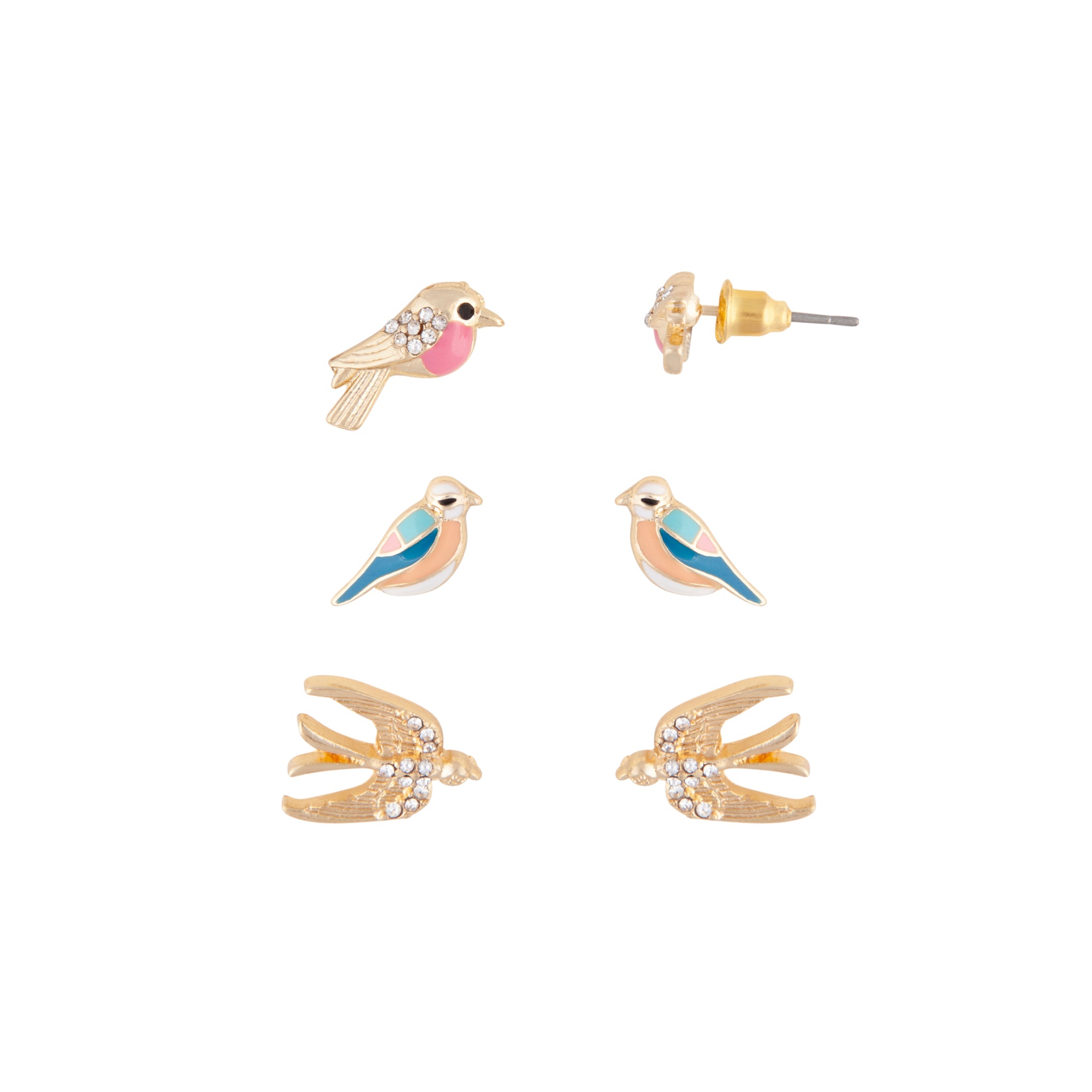A trio of bird stud earrings with multi-coloured enamel and a gold tone.