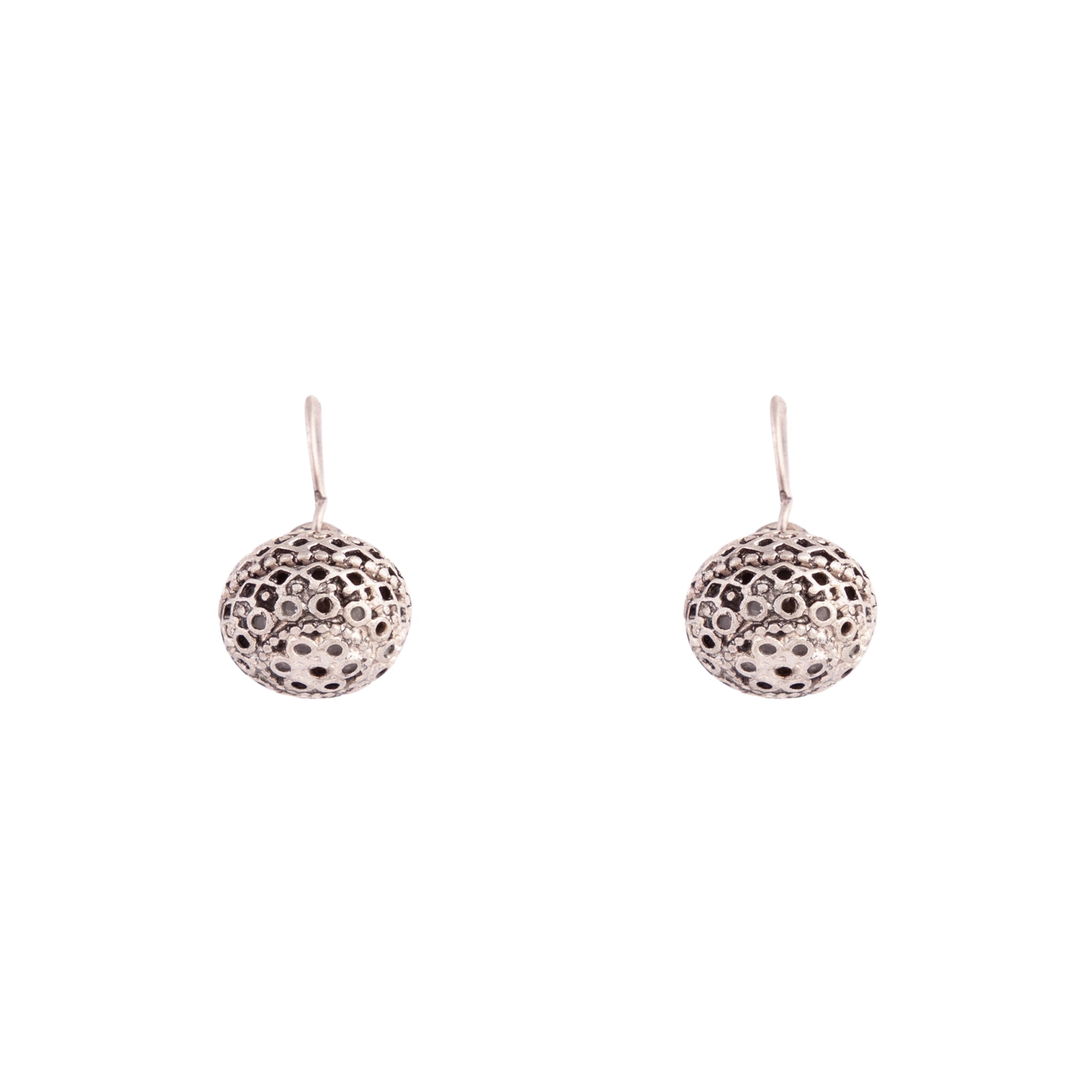 A pair of antique-silver drop earrings featuring a detailed ball.