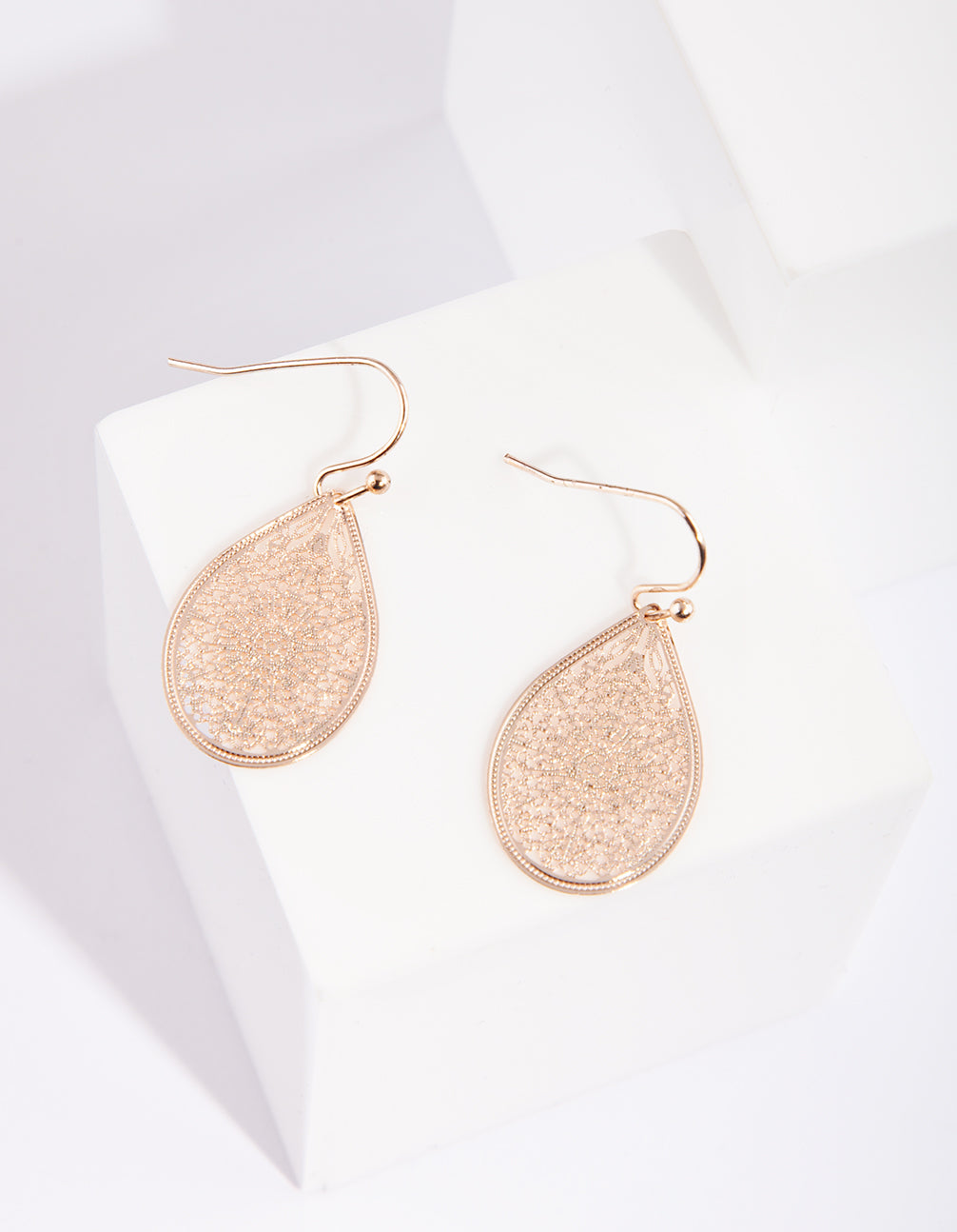 Rose Gold Filigree Lace Tear Drop Earrings