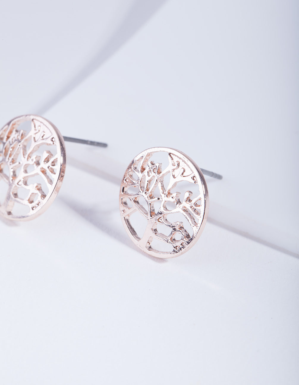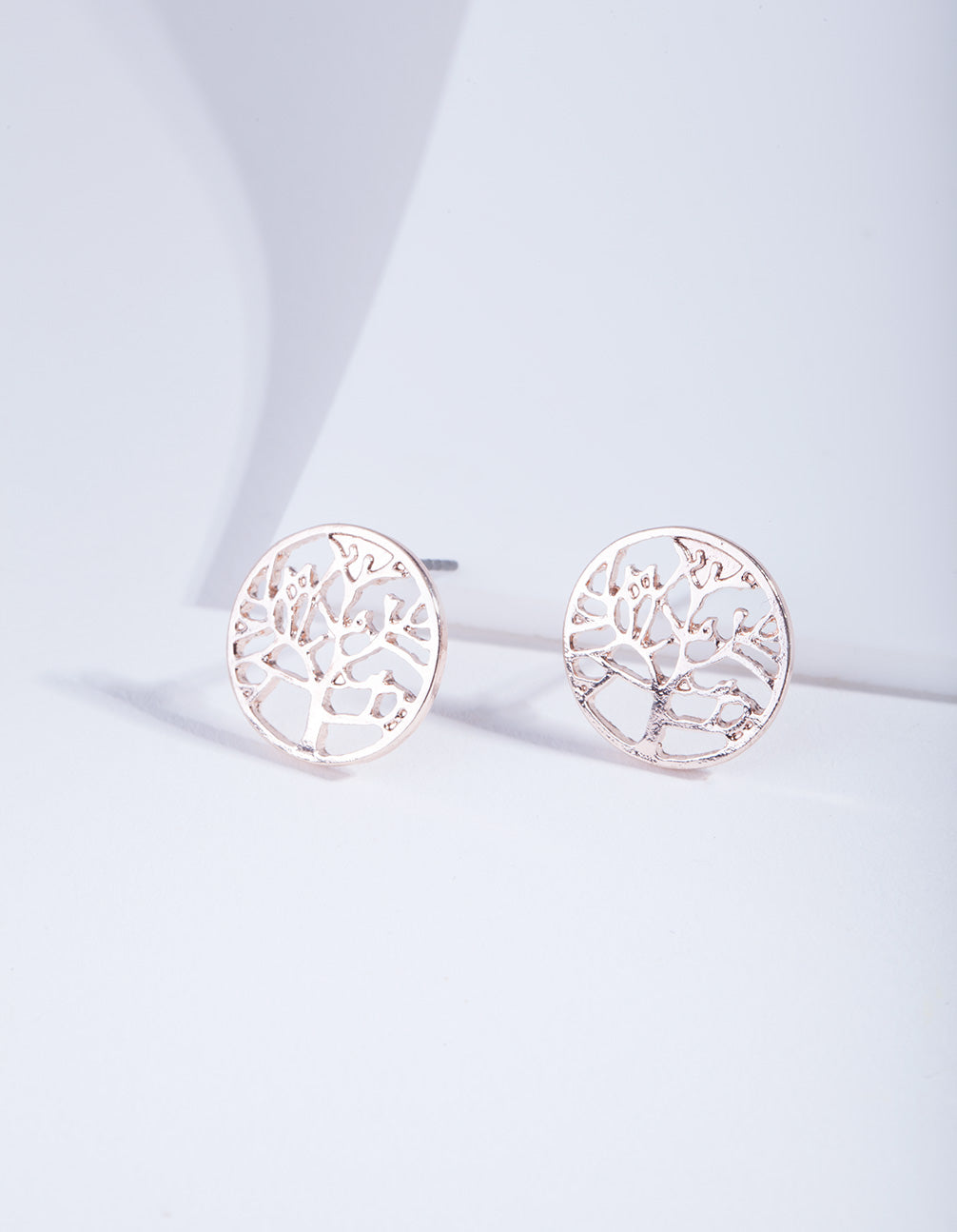 These stud earrings feature a rose gold toned tree of life design, representing alignment and wisdom.