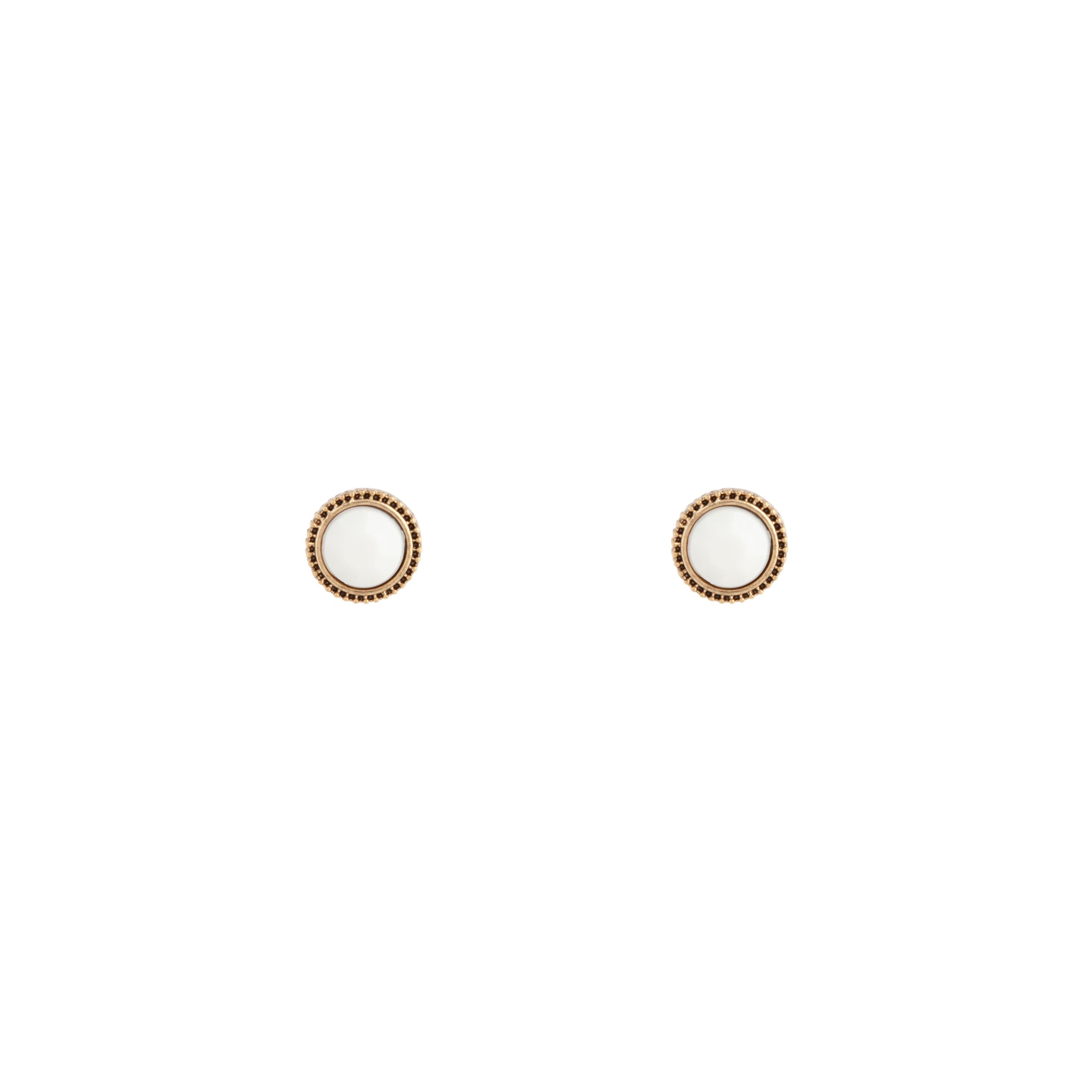 A pair of white round stud earrings with a gold-toned border.åÊ