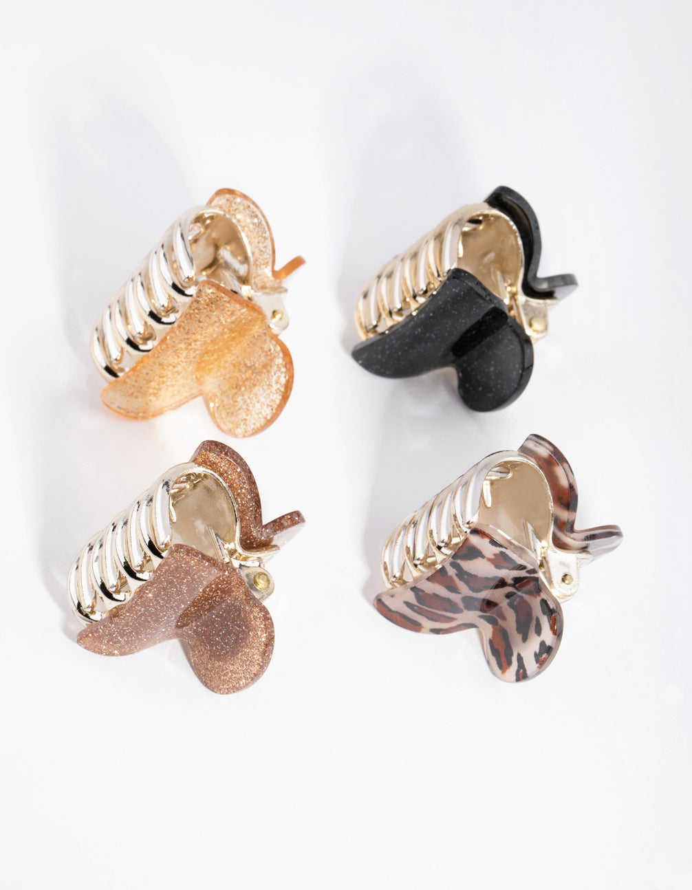 Add the perfect finishing touch to your ensemble with a hair claw! This pack boasts four, small hair claws in three funky glitter shades and one leopardr. This accessory is perfect for lounging around in, or for elevating a casual look.