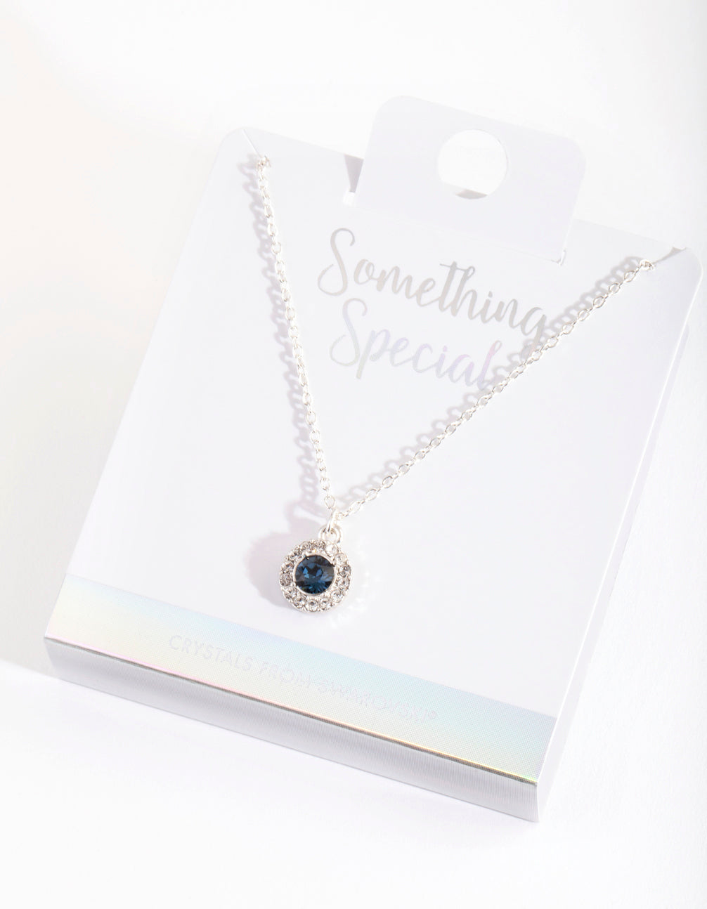 This necklace boasts a stunning midnight blue diamond-simulant crystal in a silver-toned setting.