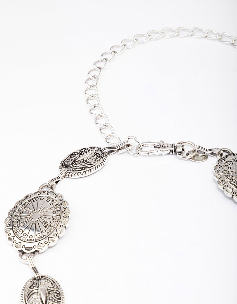 Add interest to your outfit with this trending, western-inspired waist chain. This belt features an antique silver setting, adorned with textured oval coins.
