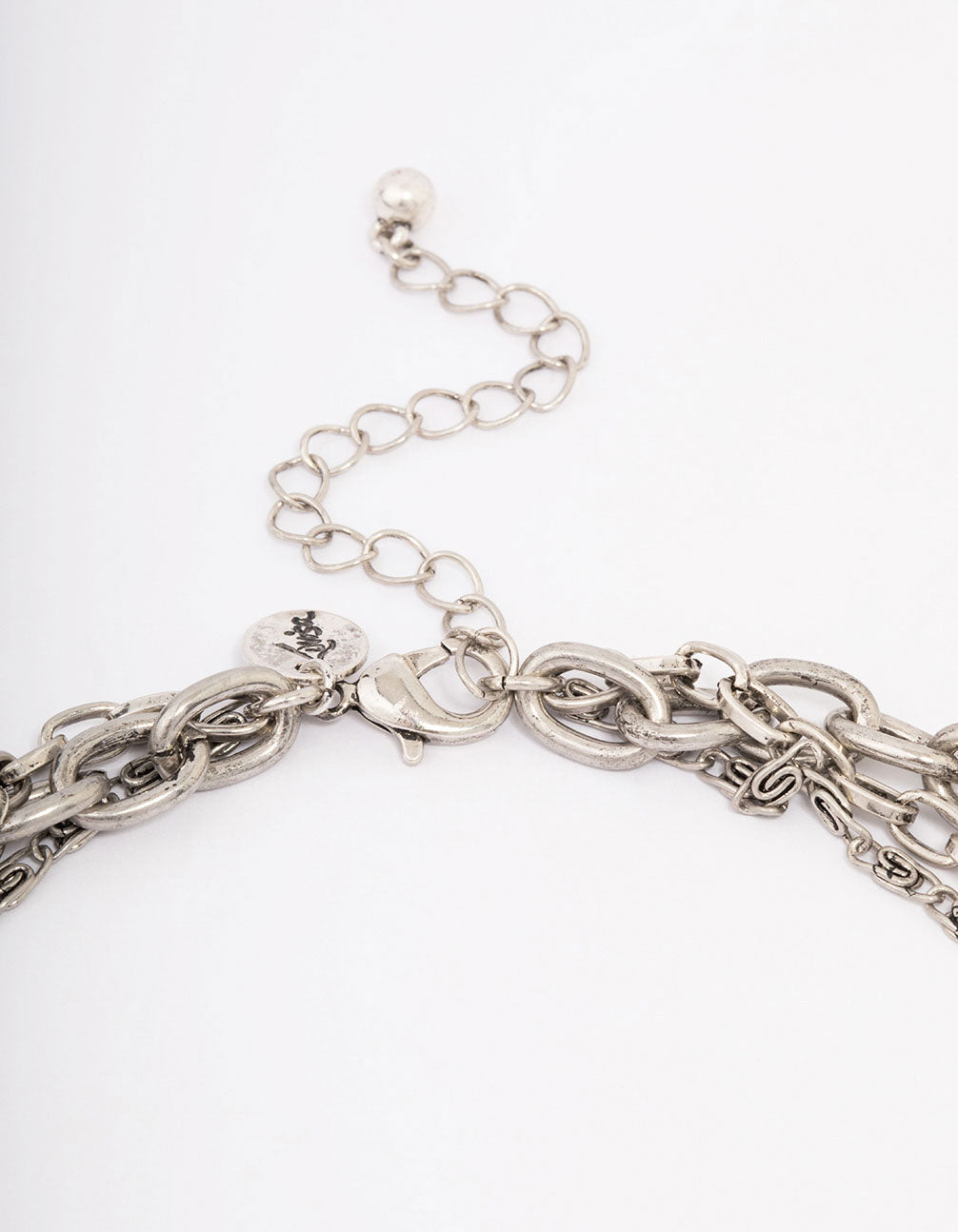 Add an on-trend finish to your look with this trending, layered necklace. This layered chain features an antique silver setting, adorned with butterfly and cross motifs for a decorative finish.