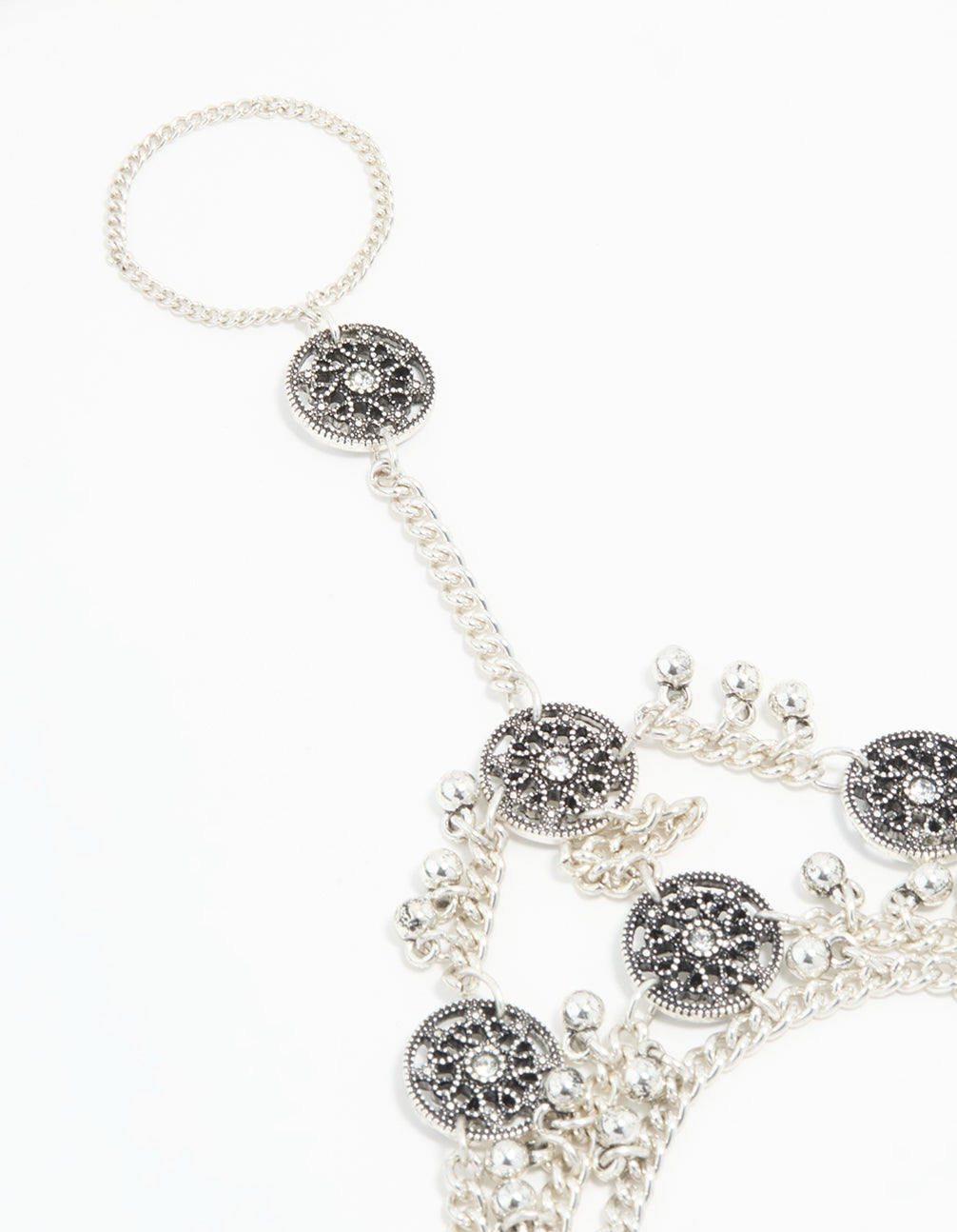 Add a touch of vintage charm to your look with this Antique Silver Coin Hand Chain. Crafted from antique silver-toned metal, this stunning piece is a layered hand chain featuring intricate coin details that bring a unique, boho-inspired vibe to your outfit. Ideal for those seeking stylish body jewellery or standout accessories, this hand chain is perfect for festivals, beach days, or adding flair to casual outings. Pair it with flowy dresses, denim shorts, or even stack it with rings and bracelets for an effortlessly chic layered look. Whether you're dressing up or keeping it casual, this hand chain is a versatile addition to your jewellery collection, blending style and individuality beautifully!