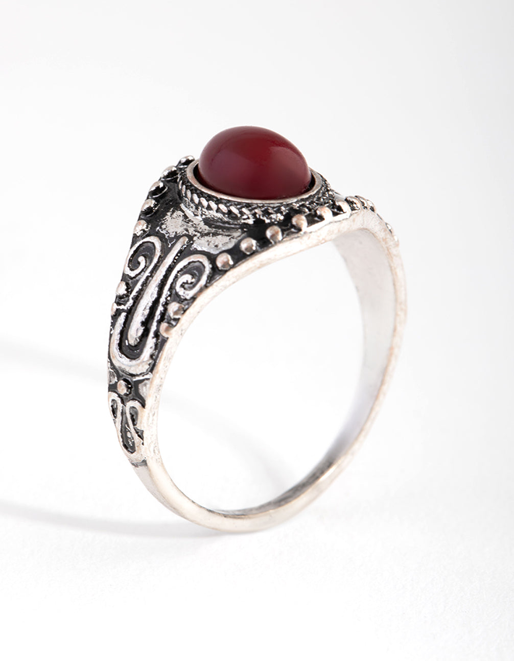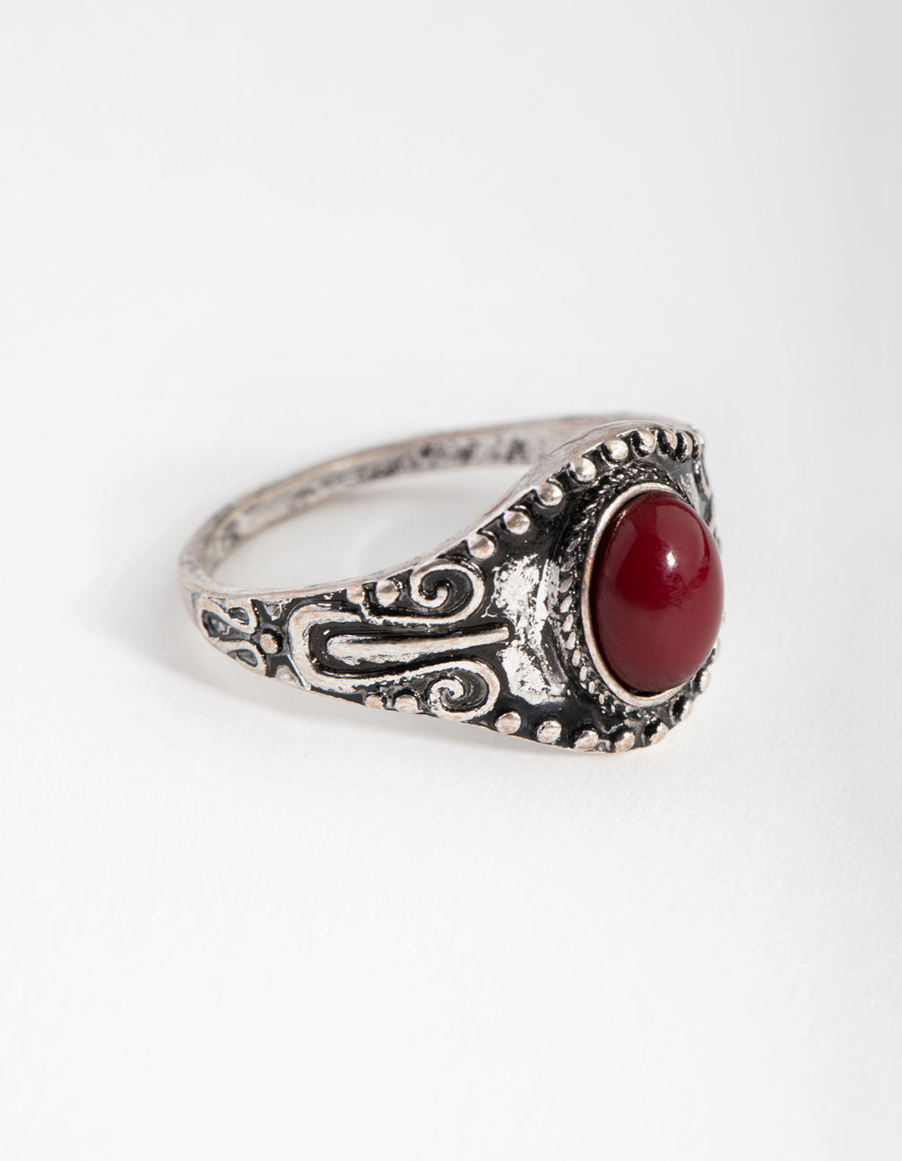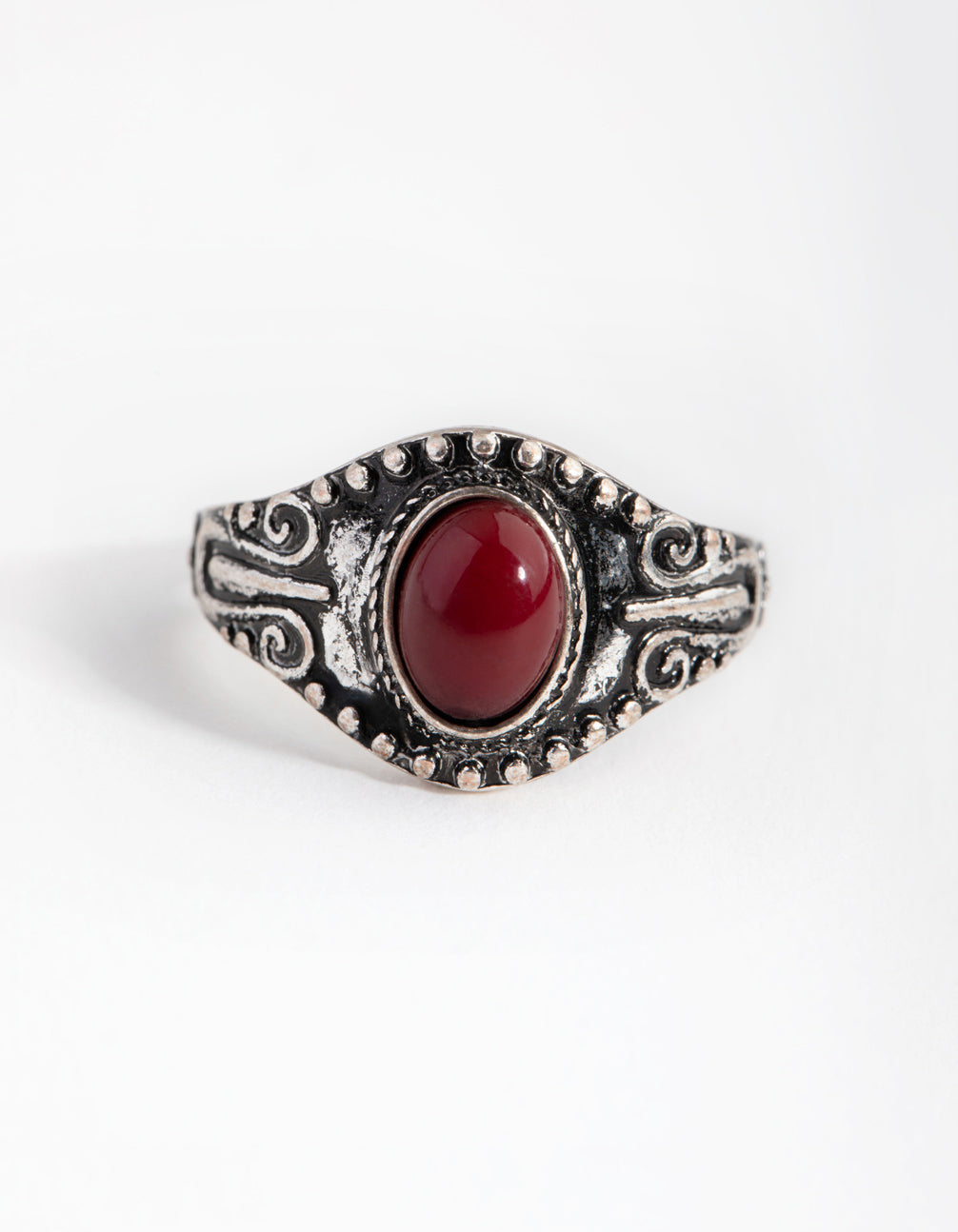Mix them, match them, stack them! This funky ring is silver toned with an antique finish. It boasts an perfect-cut red diamante at its centre. Stack it with other pieces for maximum impact!