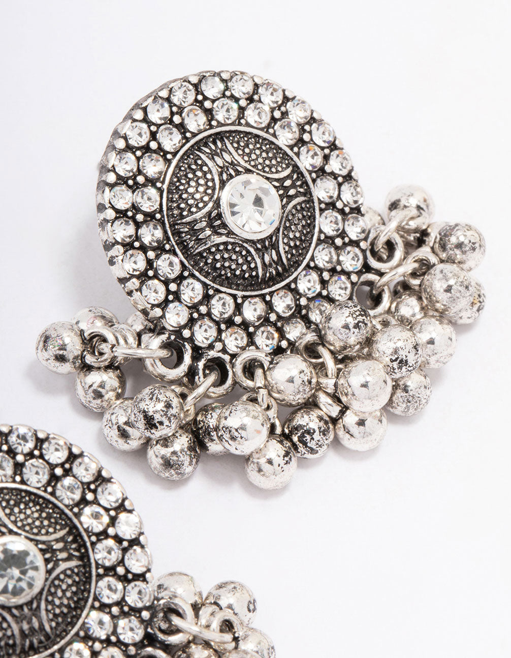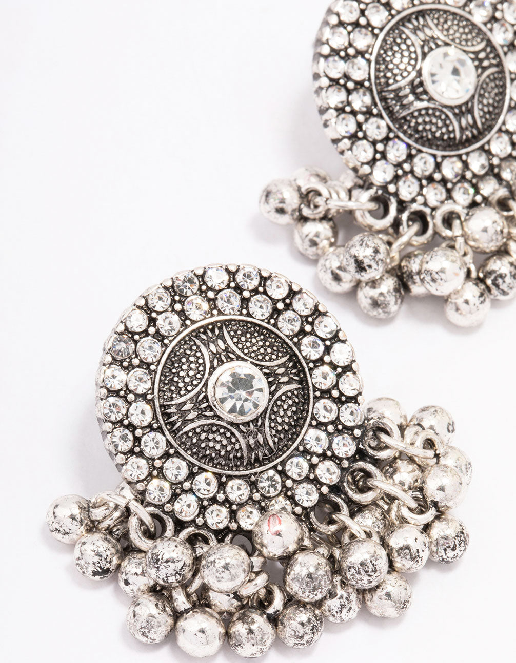 Embellish your look with these antique silver drop earrings. These unique statement earrings feature a round, detailed silhouette adorned with a collection of round balls for a textural finish.