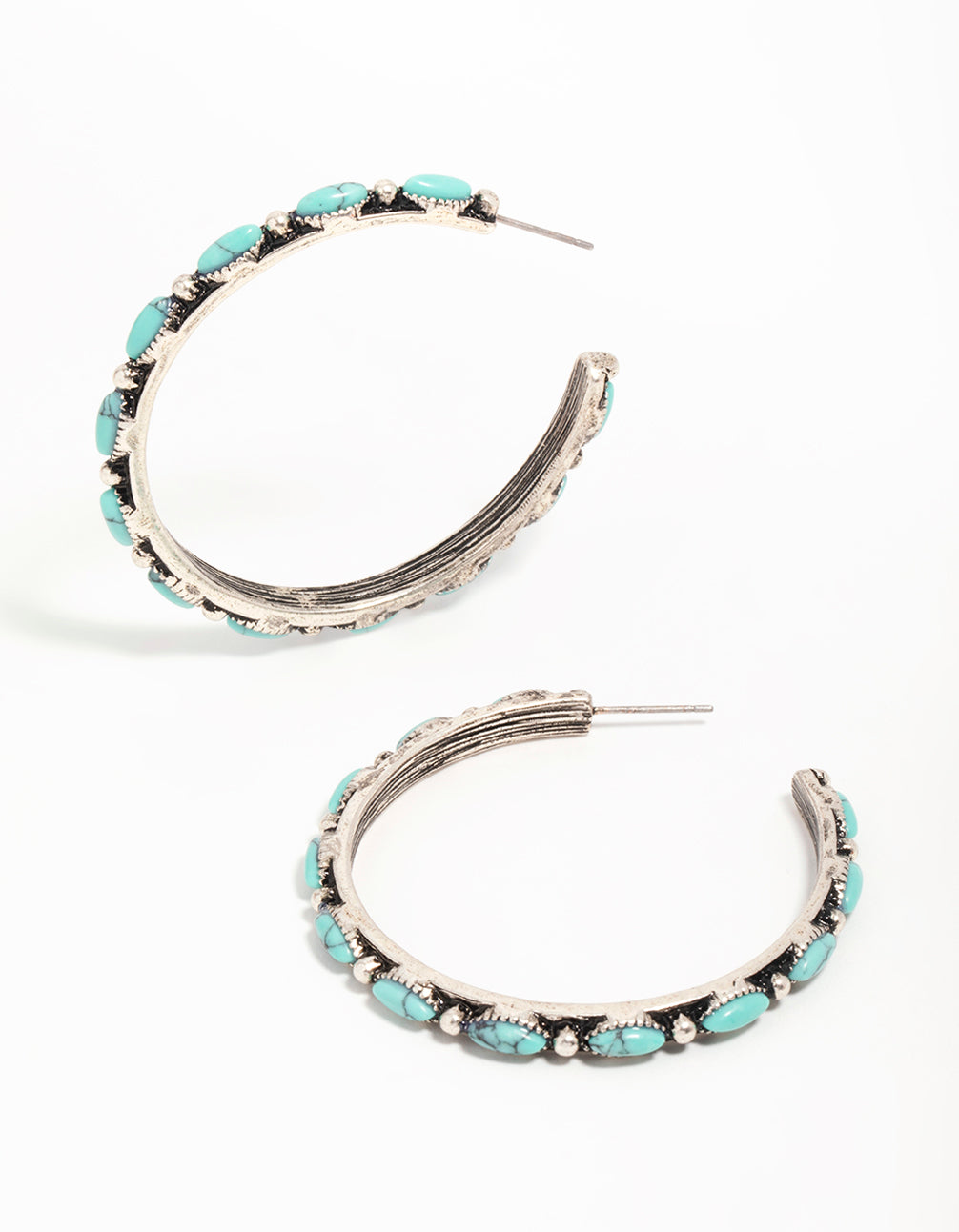 Add a touch of boho charm to your look with these stunning Antique Silver Turquoise Large Hoop Earrings. Featuring a sleek antique silver finish and bold turquoise accents, these hoops are the perfect blend of vintage-inspired elegance and modern style. The large, circular design makes them a standout accessory, ideal for festivals, casual brunches, or even dressing up a simple outfit for a night out. Pair them with a flowy maxi dress or distressed denim and a chic blouse for effortless vibes. These versatile earrings are a must-have for anyone who loves unique jewellery with a splash of colour. Whether you're a fan of statement hoops, turquoise jewellery, or antique silver accessories, these earrings are the perfect way to elevate your collection!