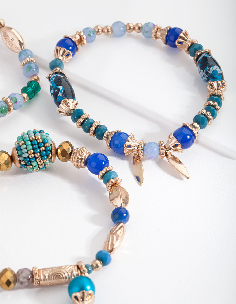 • Composition: Blue and gold-toned beads on elastic string