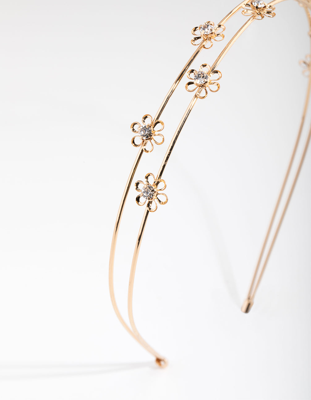 Add a touch of whimsy to your outfit with glittering hair accessories. This beautiful gold-toned headband features a dual-band design studded with dainty flowers with sparkling diamantes at their centre. Wear it and get noticed!