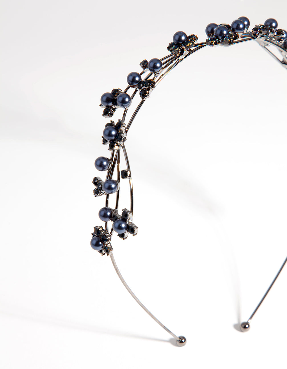 Add a touch of whimsy to your outfits by experimenting with hair accessories. This gorgeous gunmetal toned headband features midnight-blue faux pearls and glittery navy diamantes. Wear it to elevate your evening edits, or during the day for a dramatic look.