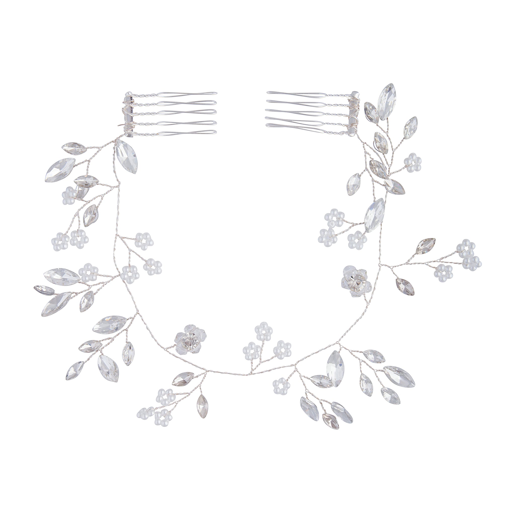 Whether you are heading to a wedding or just wanting to look glamorous for a party, this hair accessory is the perfect way to complete your event ensemble! This intricate hair vine comes in a silver tone with gem and pearl embellishments. Style into an evening hairstyle and secure with hairspray before sliding this hair wrap into place to make you feel glamorous all night long.