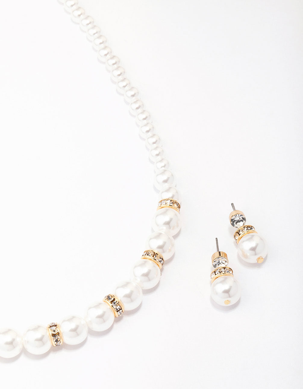 Complete your outfit with this stunning, pearl jewellery set. This matching set contains a chain necklace and pair of adorning stud earrings adorned with pearls.