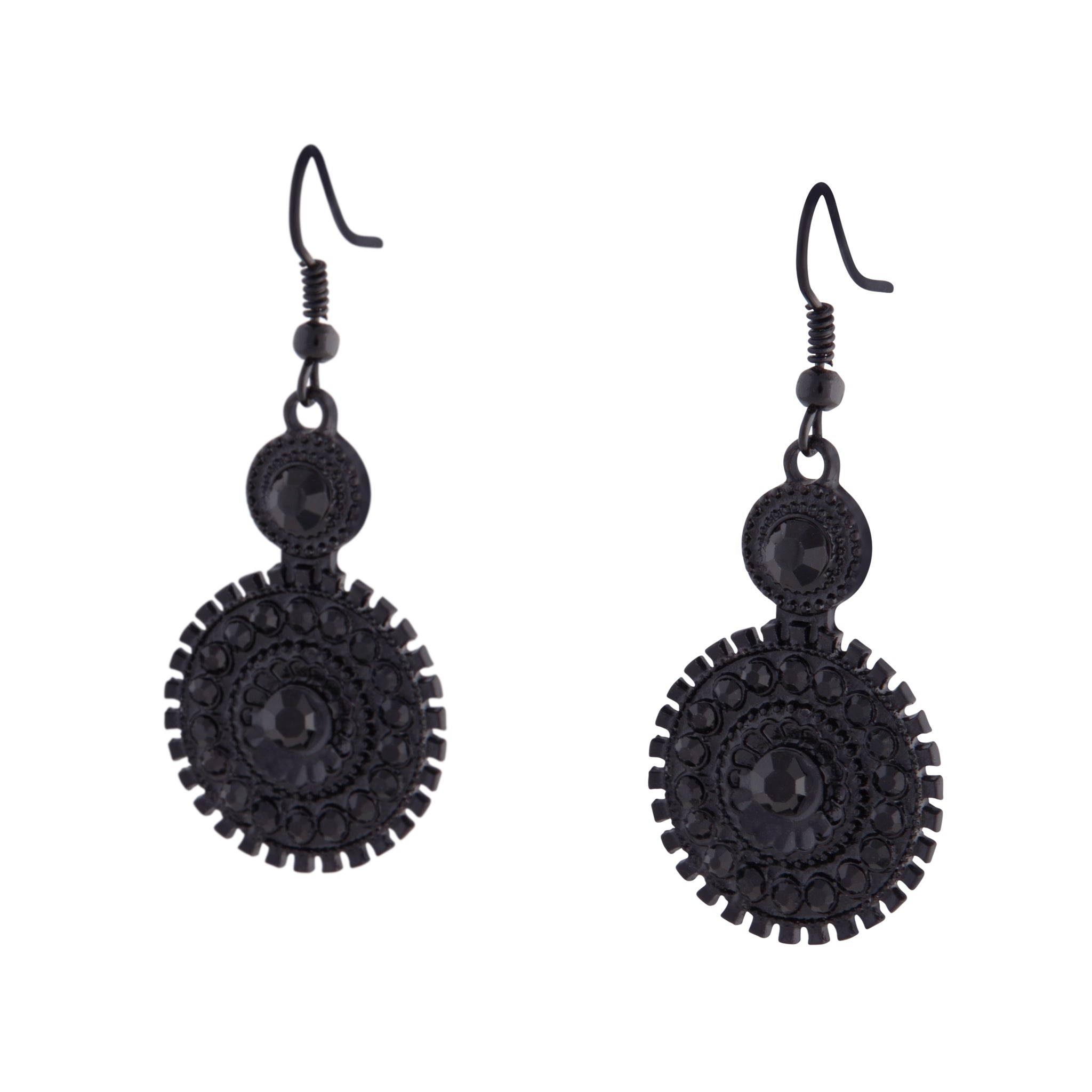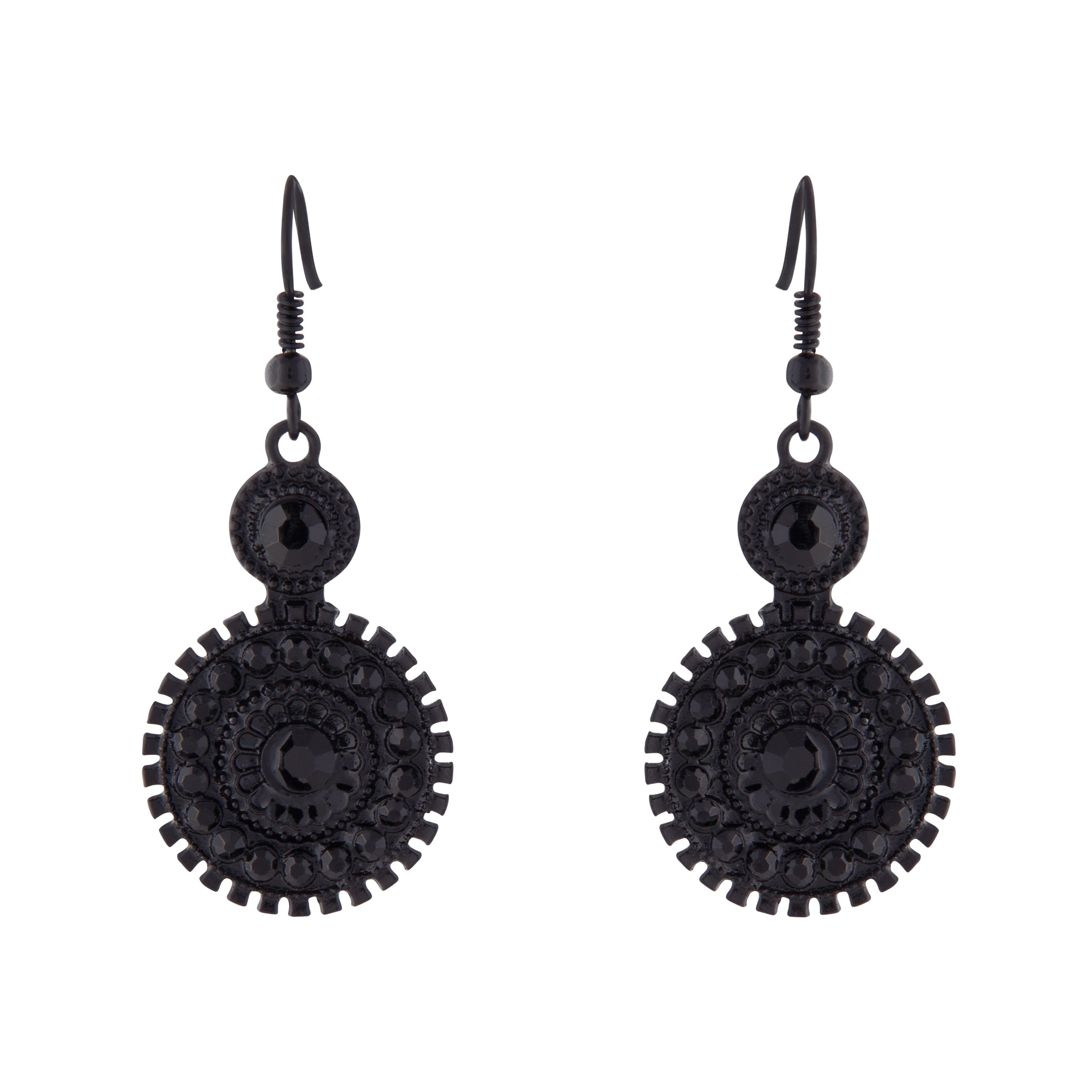 Glimmer and shine with diamantes and gems and add some glamour to your evening edits. Two circular discs in black coated metal are suspended from a hook giving modern edge to a classic style. Style with black accessories and a classic cat eye for a bold look yet elegant look.