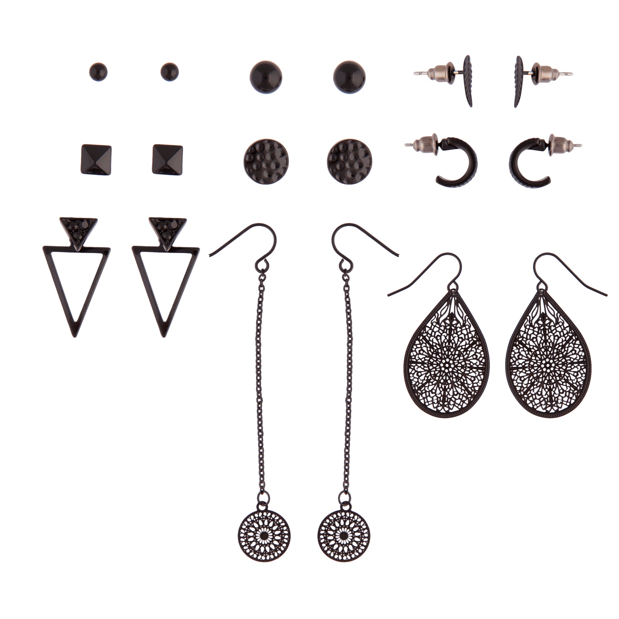 Always have something to wear with a curated Lovisa earring pack. This set comes with 9 pairs of intricate earrings, all with a matte black finish. Style with statement black rings and layered necklaces for a dramatic look.