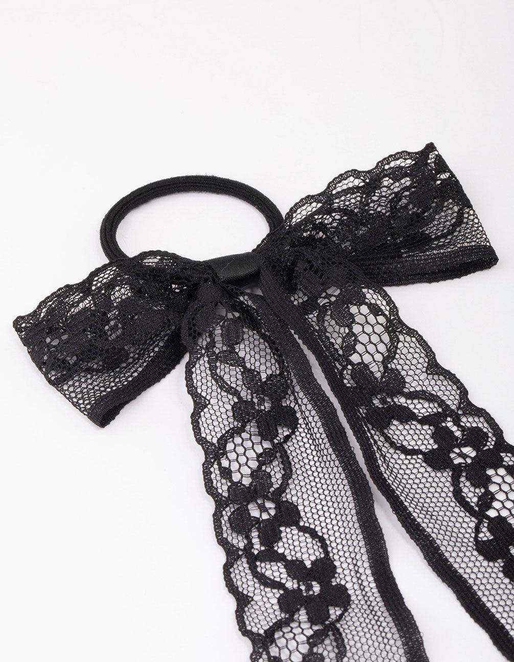Bows are trending! Style the coquette trend with this chic, black lace hair scrunchie.
