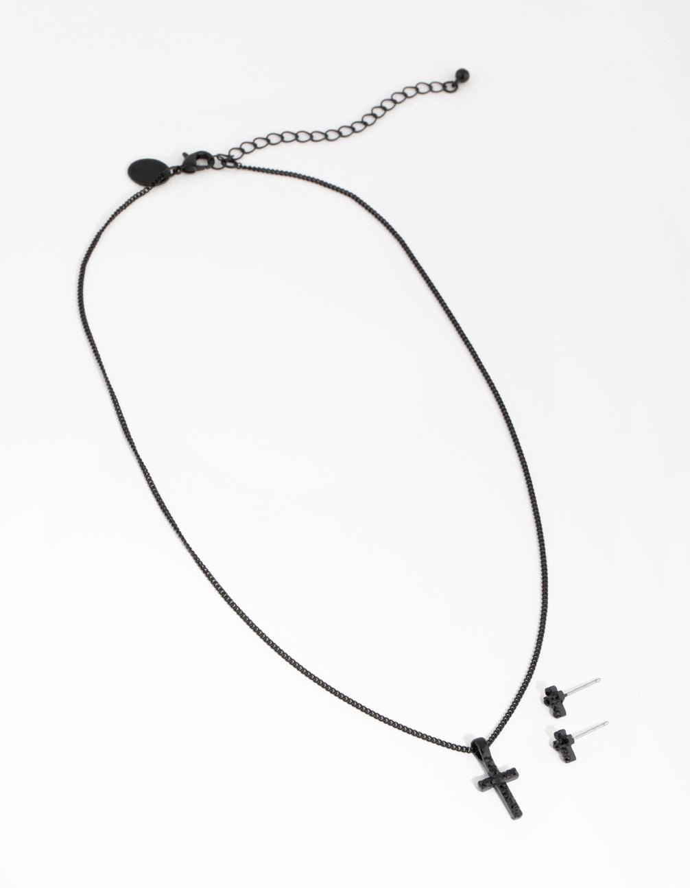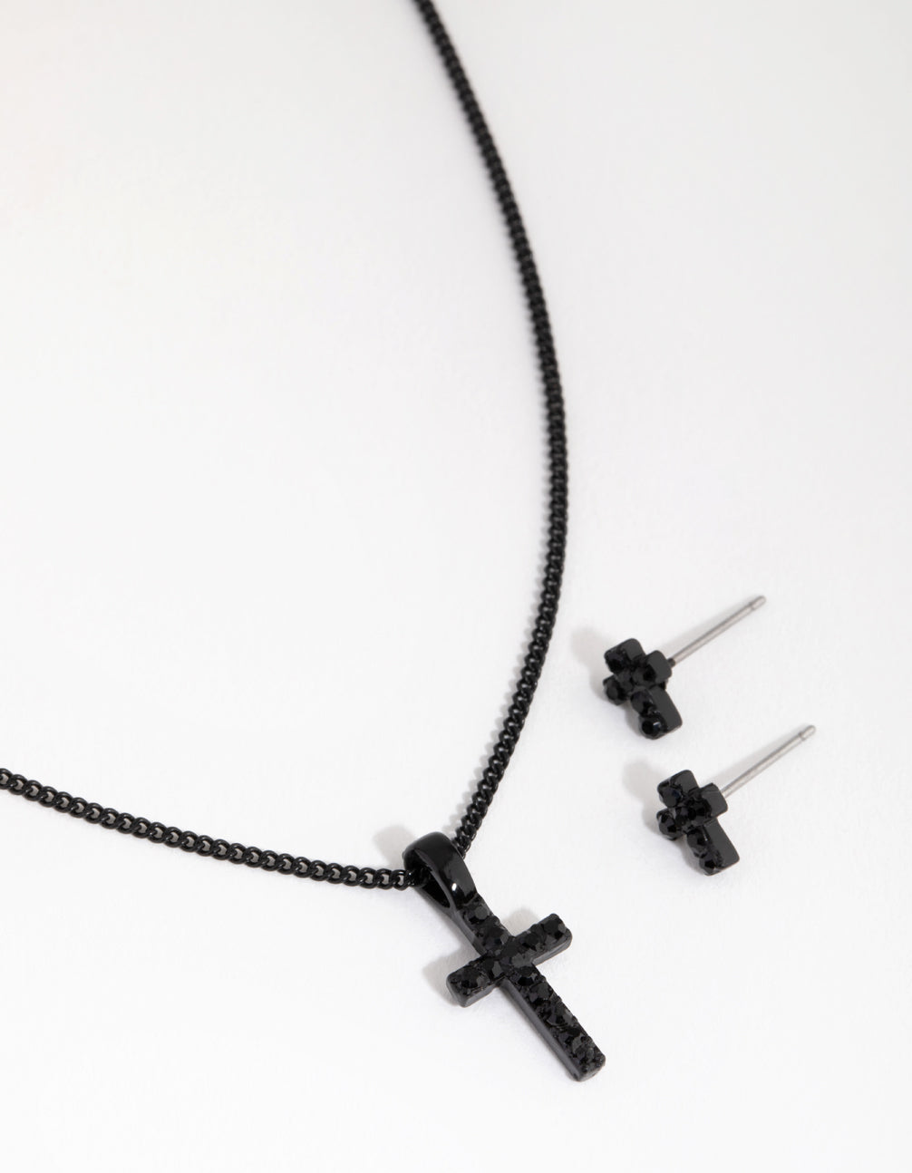 Gift someone special or treat yourself with versatile pieces that feature sparkling elements. This necklace is black, and features a cross design that's studded with glittering, black diamantes. A matching pair of studs complete the look. This piece comes in an elegant black box which makes it perfect for gifting!