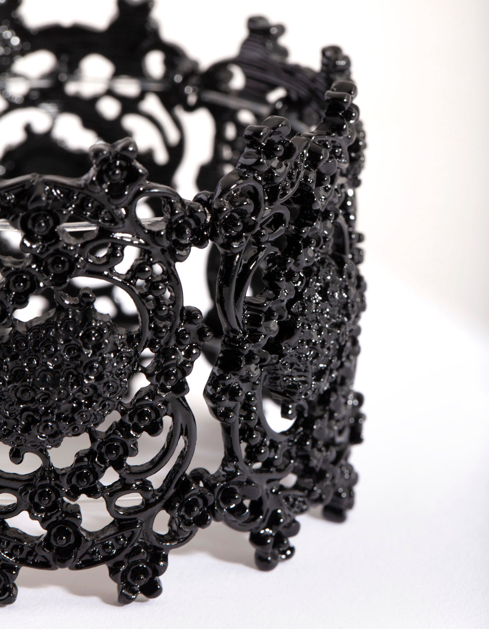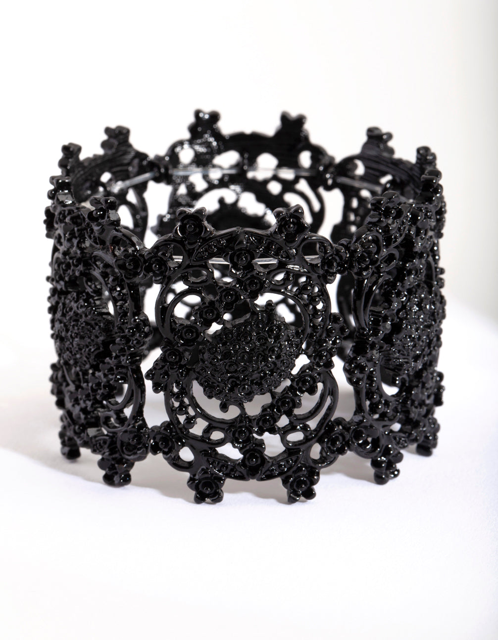 A classic glimmering bracelet is essential to any wardrobe. This black coated metal bracelet features a crater design and is a stretch fit.