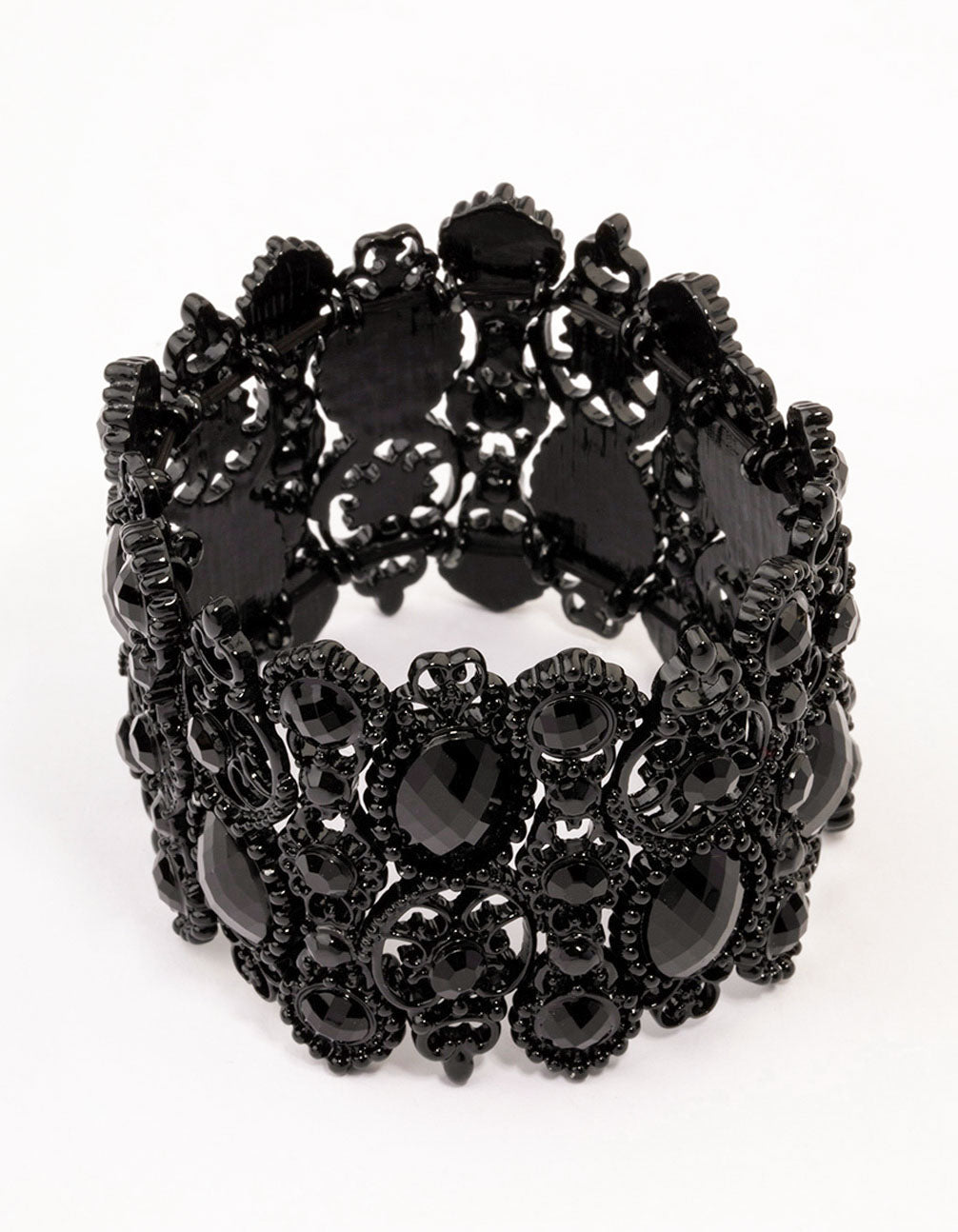 This stretchy bracelet is crafted from black lace and features a unique pattern adorned with black diamantes for a drama-filled look.