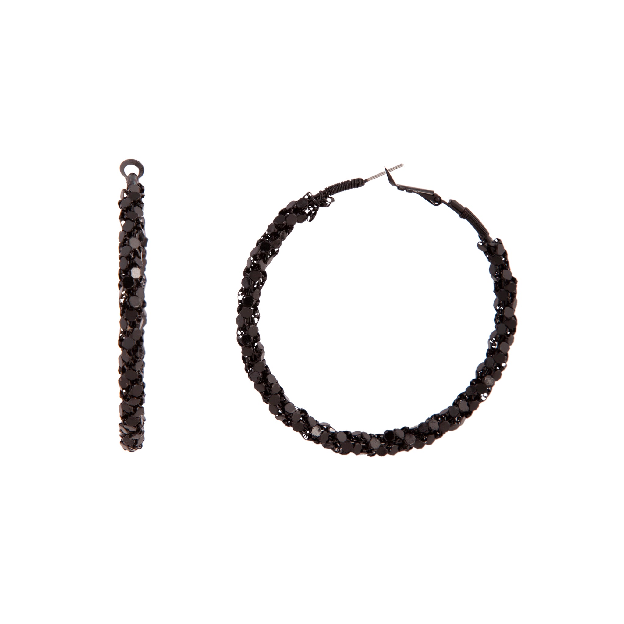 Add some drama to your look with these edgy fashion earrings. This stunning pair of 5.5cm black hoop earrings feature a mesh covered design. Elevate a casual outfit with this essential must-have earring set.