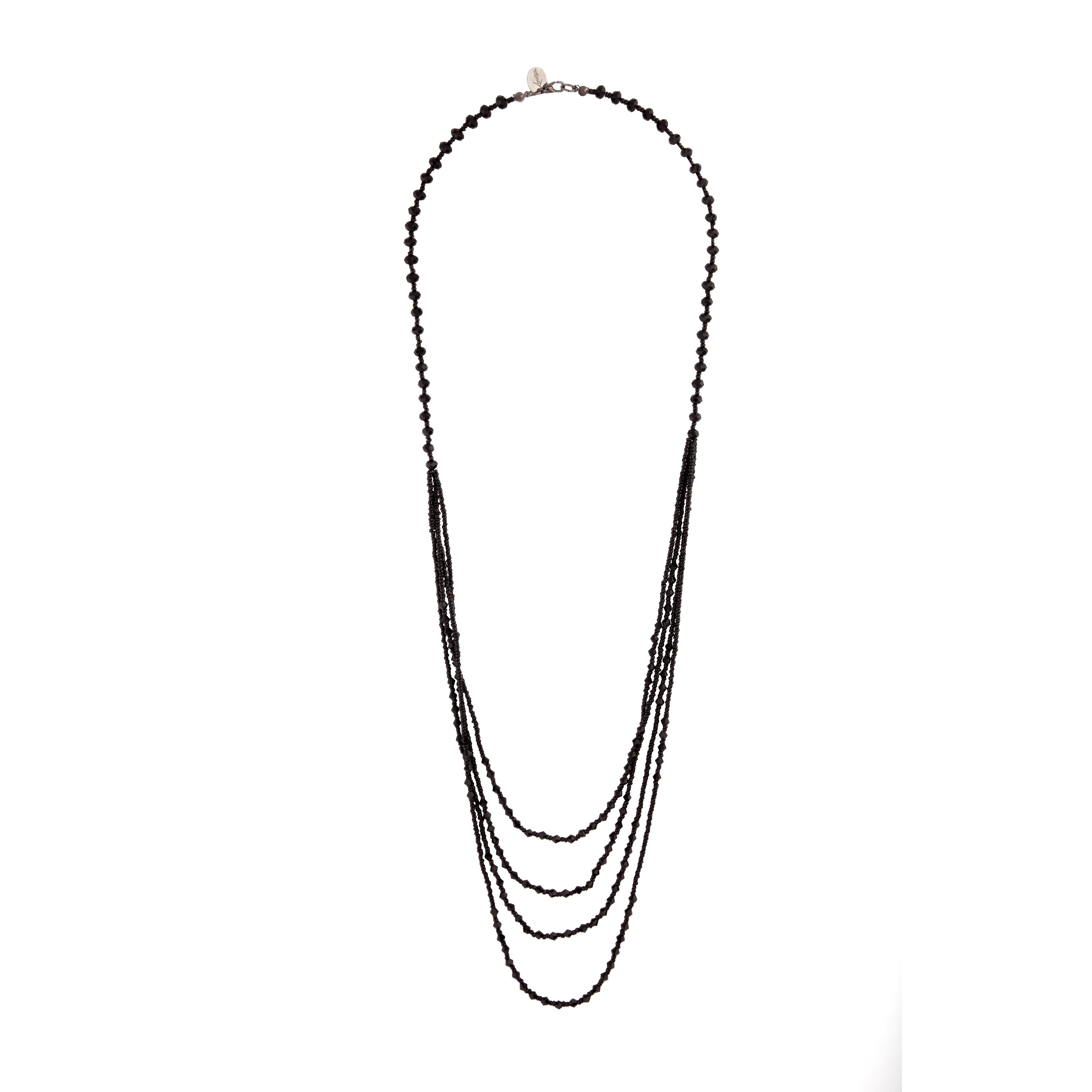 Add a bit of drama to any outfit with black accessories. Each layer combines different sizes of beads for a textured look. Make layering easy with this black faceted bead necklace.