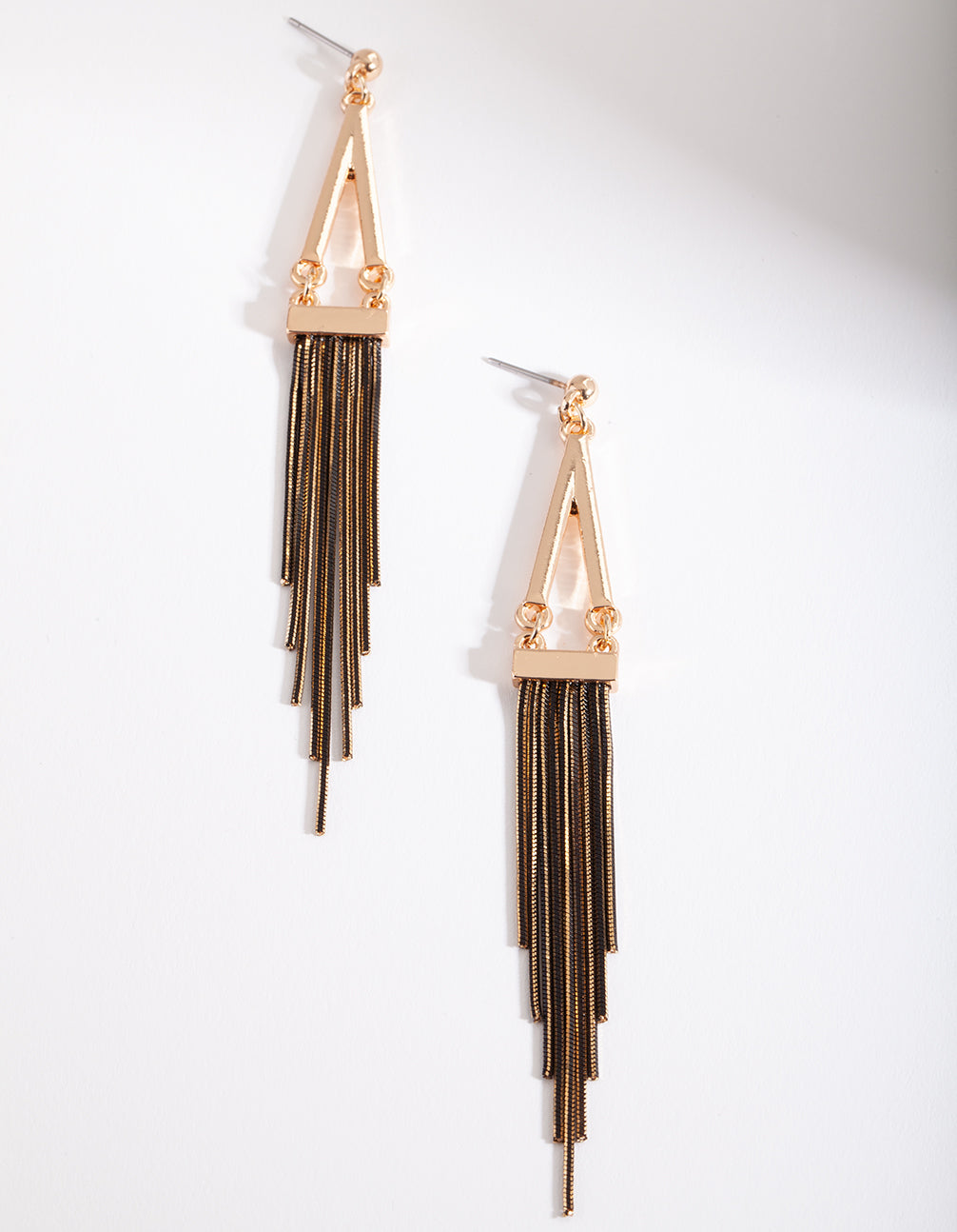 A fun pair of fashion earrings are an easy way to spice up your daily ensembles! These earrings boast a chain tassel design in a black and gold tone. Style with gold rings, sleek hair and a bold lip for a dramatic look.