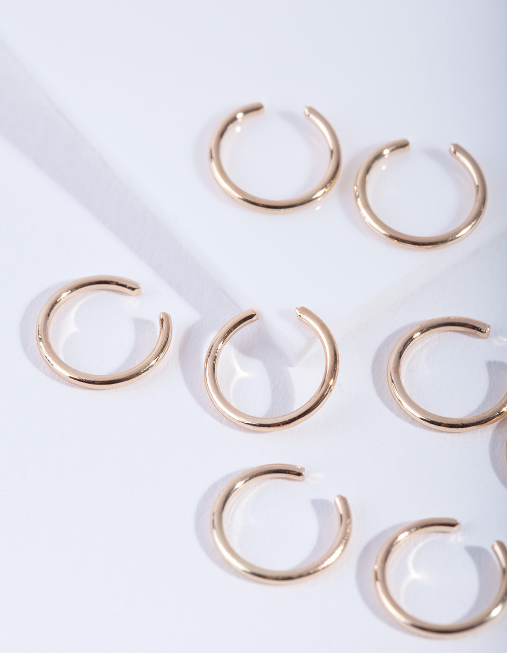 This pack features eight fake piercing rings in a gold tone. Trial and experiment with fake piercings; no needles necessary - just interchangeable style! These rings can be used for faux lip, ear or nose piercings. Try layering the varying sizes to create the look of an on-trend 'ear stack'!