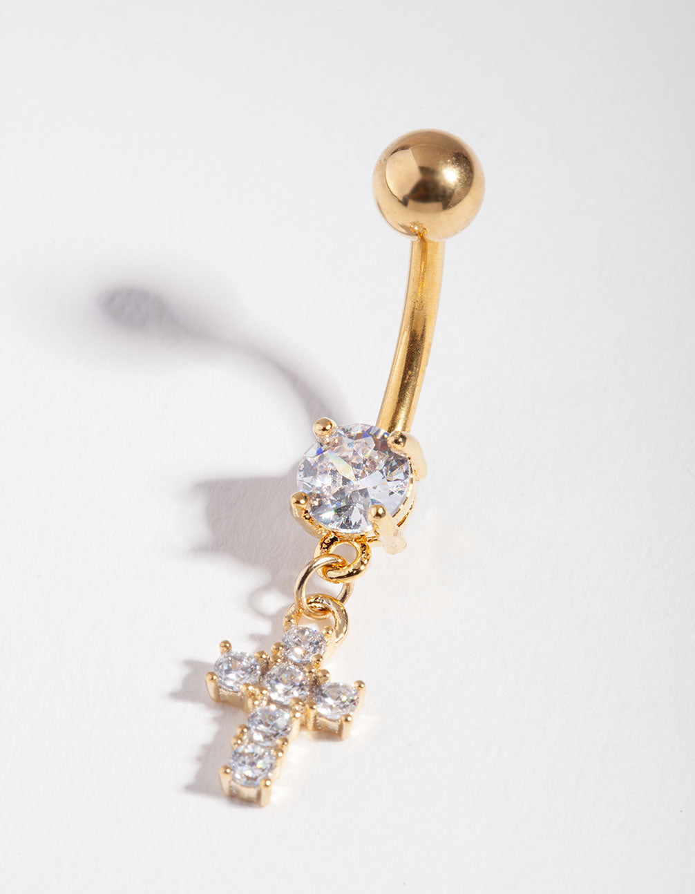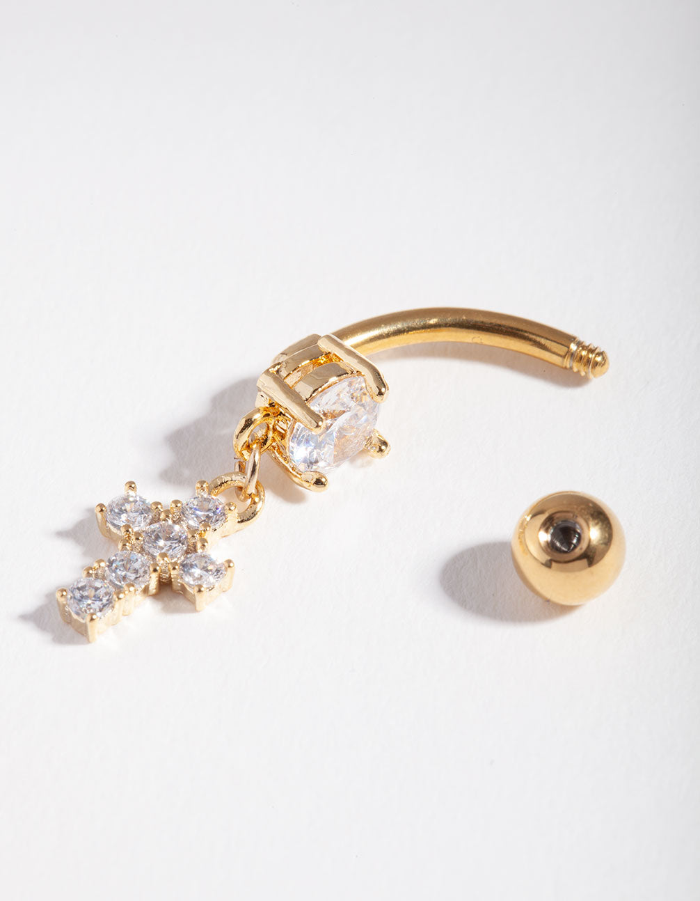 Gold Surgical Steel Cubic Zirconia Cross Dangle Bellybutton
