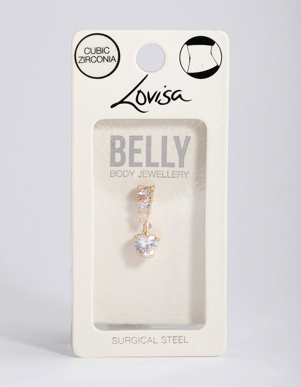 - This belly piercing is plated with real gold and features heart-shaped, cubic zirconia embellishments for added interest. Pair this piercing with matching accessories from our Heart Edit for a lovable look.