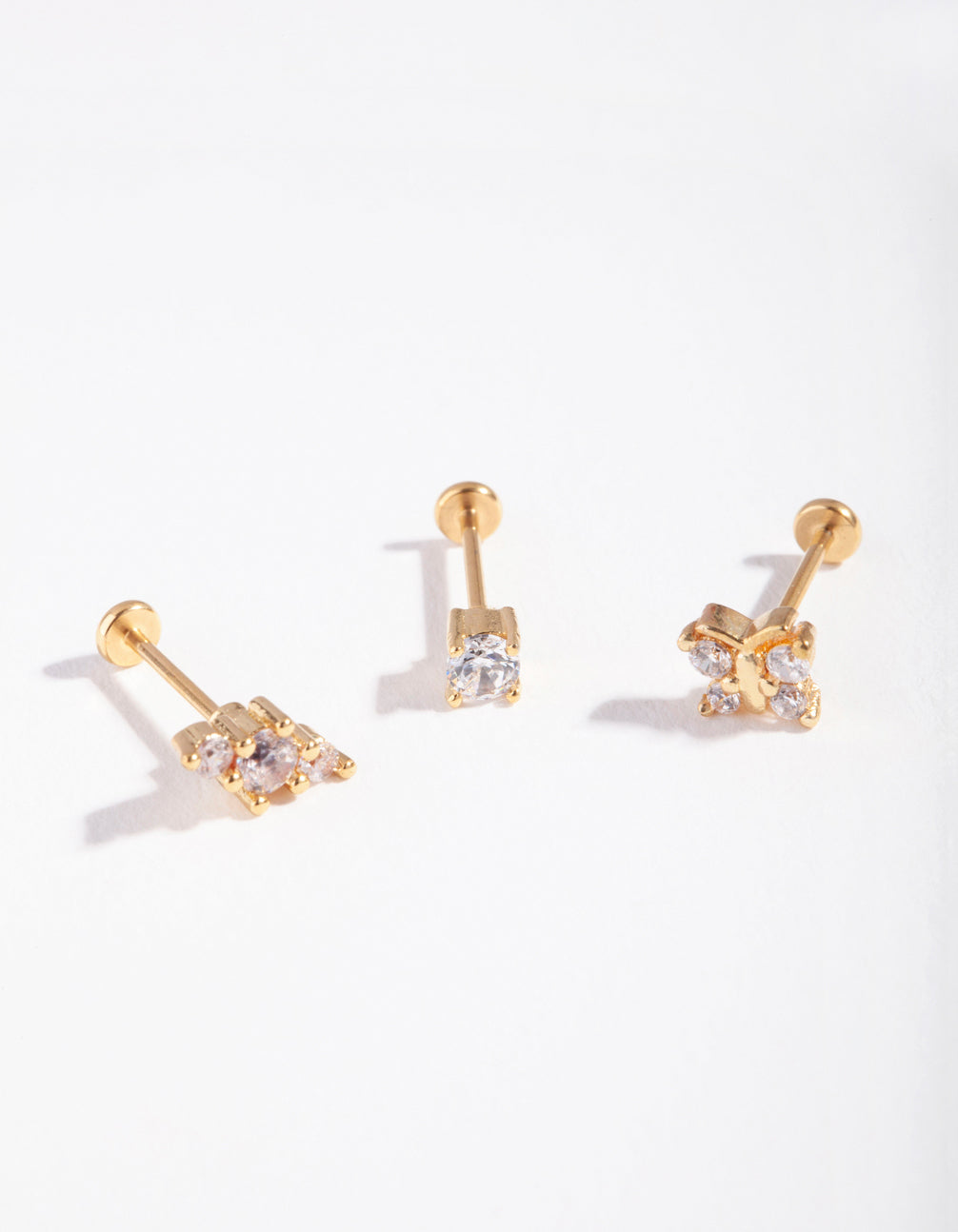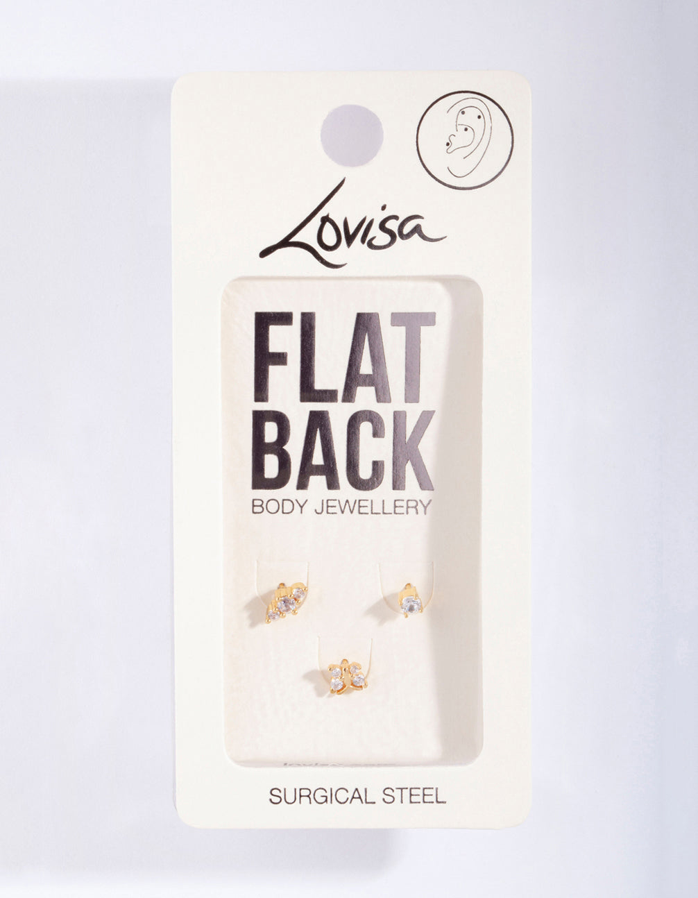 Elevate your ear stack with this flat back ear pack, featuring a variety of gold-toned butterfly designs. These earrings have surgical steel posts.