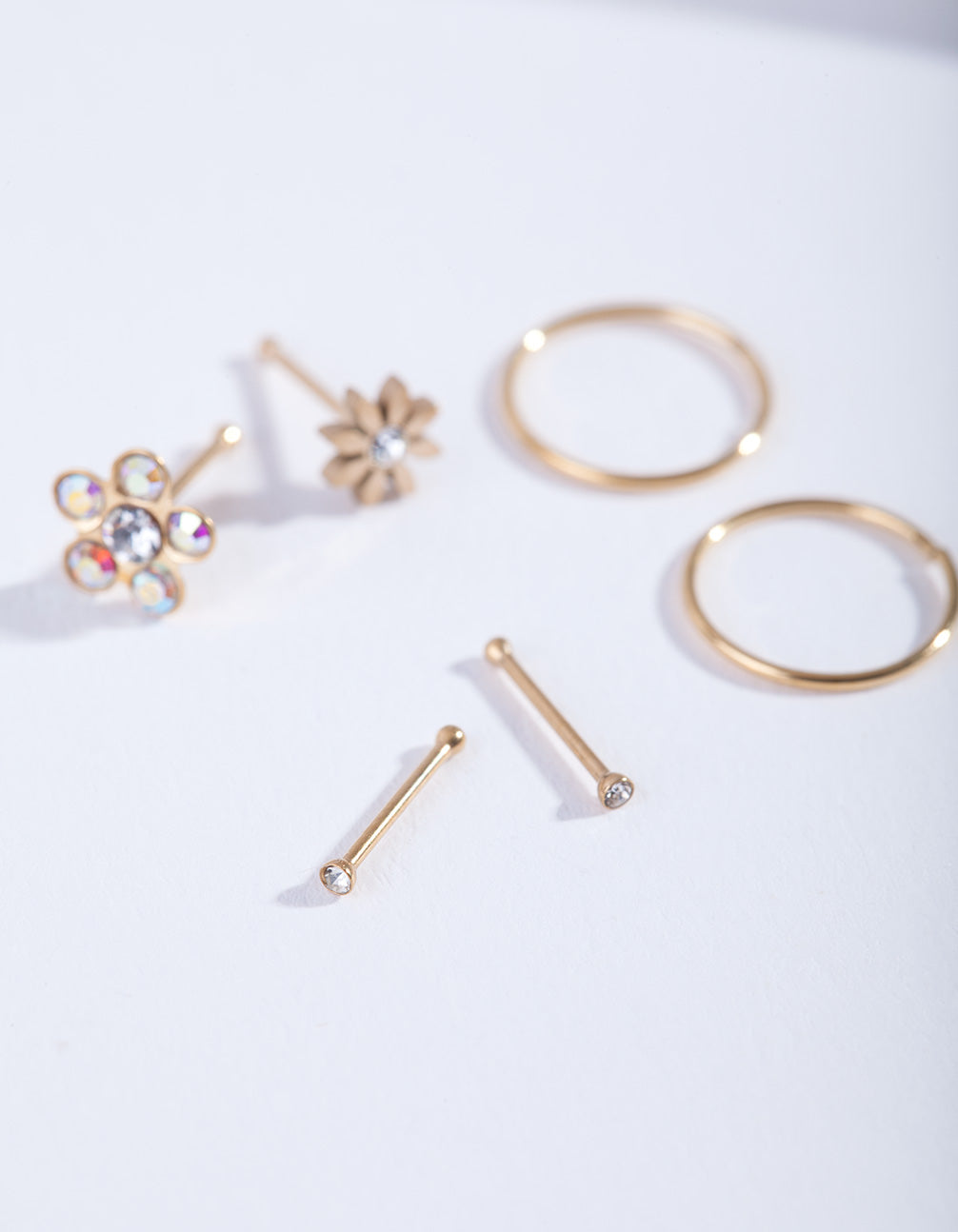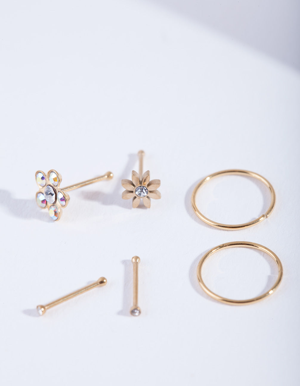 Lovisa body jewellery is made from surgical steel, making it the perfect option for everyday wear. This collection has been made with piercings in mind and features both trend-led and classic styles that you can swap out to suit any occasion. This pack boasts 6 nose studs with a floral design in a gold tone. Mix and match your nose rings to coordinate with a gold-toned accessories!
