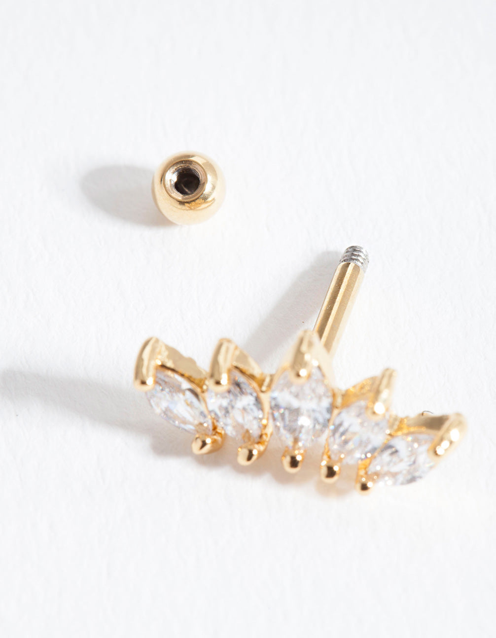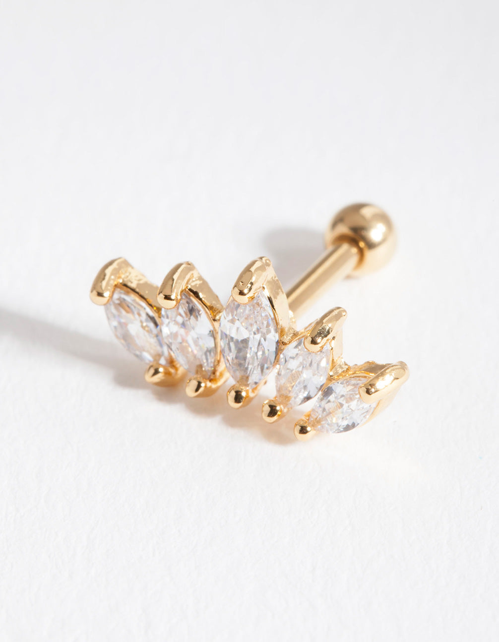 This graduating marquise stone barbell earring comes in a gold tone and is perfect for cartilage ear piercings. It has a gauge of 16, and a length of 1.2mm. It has a surgical steel post. Cartilage earrings look great as helix, conch and tragus piercings.