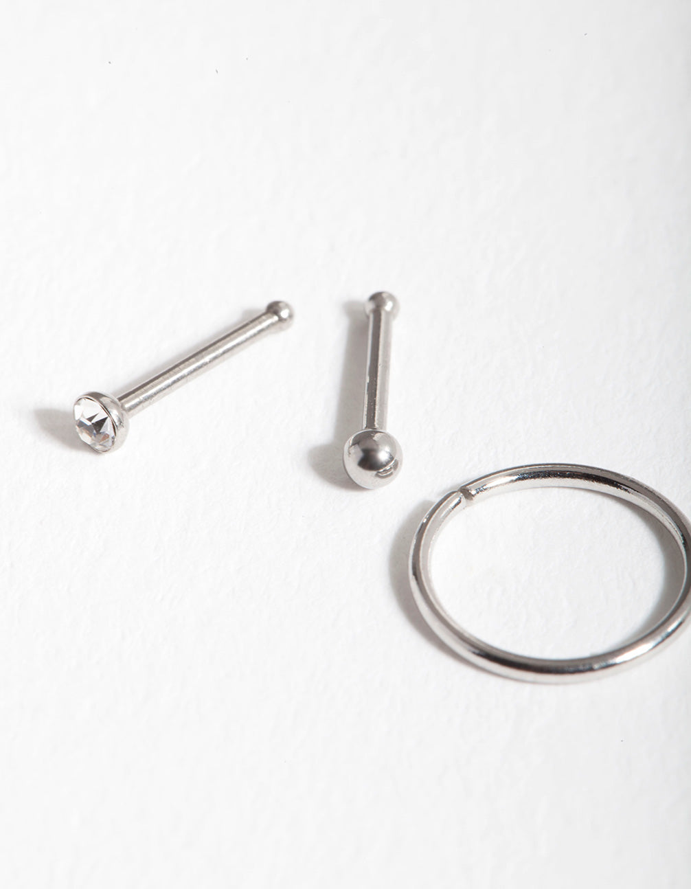 Lovisa body jewellery is made from surgical steel, making it the perfect option for everyday wear. This collection has been made with piercings in mind and features both trend-led and classic styles that you can swap out to suit any occasion. This trio of styles features a silver-toned setting with a hoop and two studs. Mix and match your nose rings to coordinate with chunky accessories for a fashion-forward look!