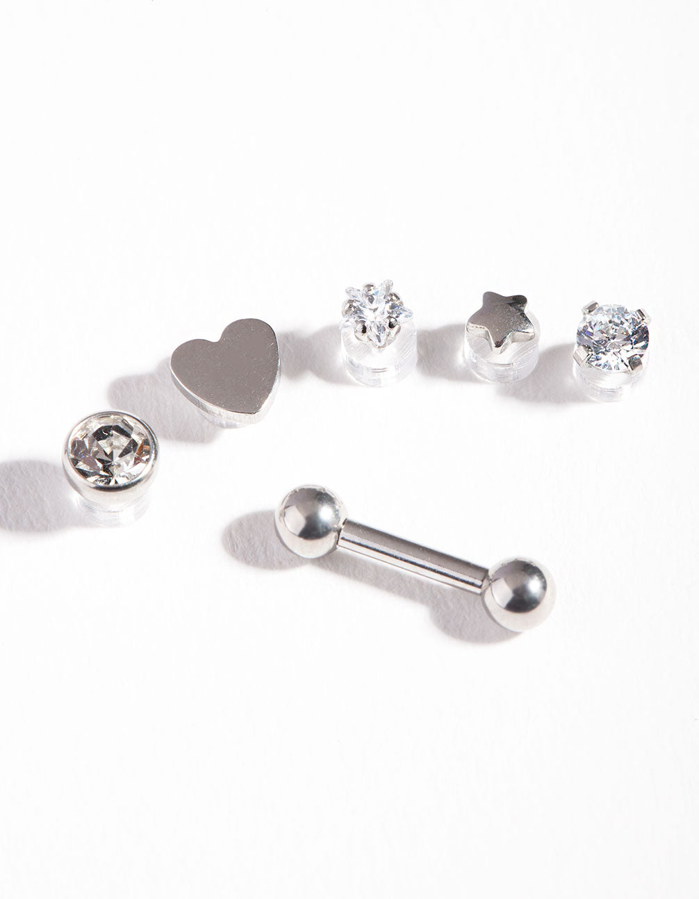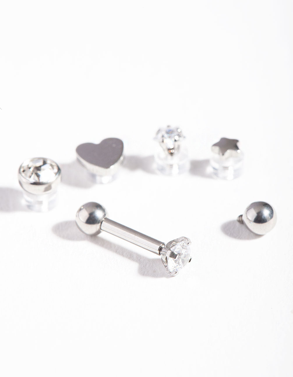 If you love piercings, the surgical steel body jewellery range from Lovisa is perfect for you. This pack comes with a silver-toned classic barbell base and a variety of interchangeable embellishments featuring cubic zirconia and shapes to dress up your look. Feel romantic with hearts or shoot for the stars, these styles will match brilliantly with other accessories from our Cubic Zirconia range.