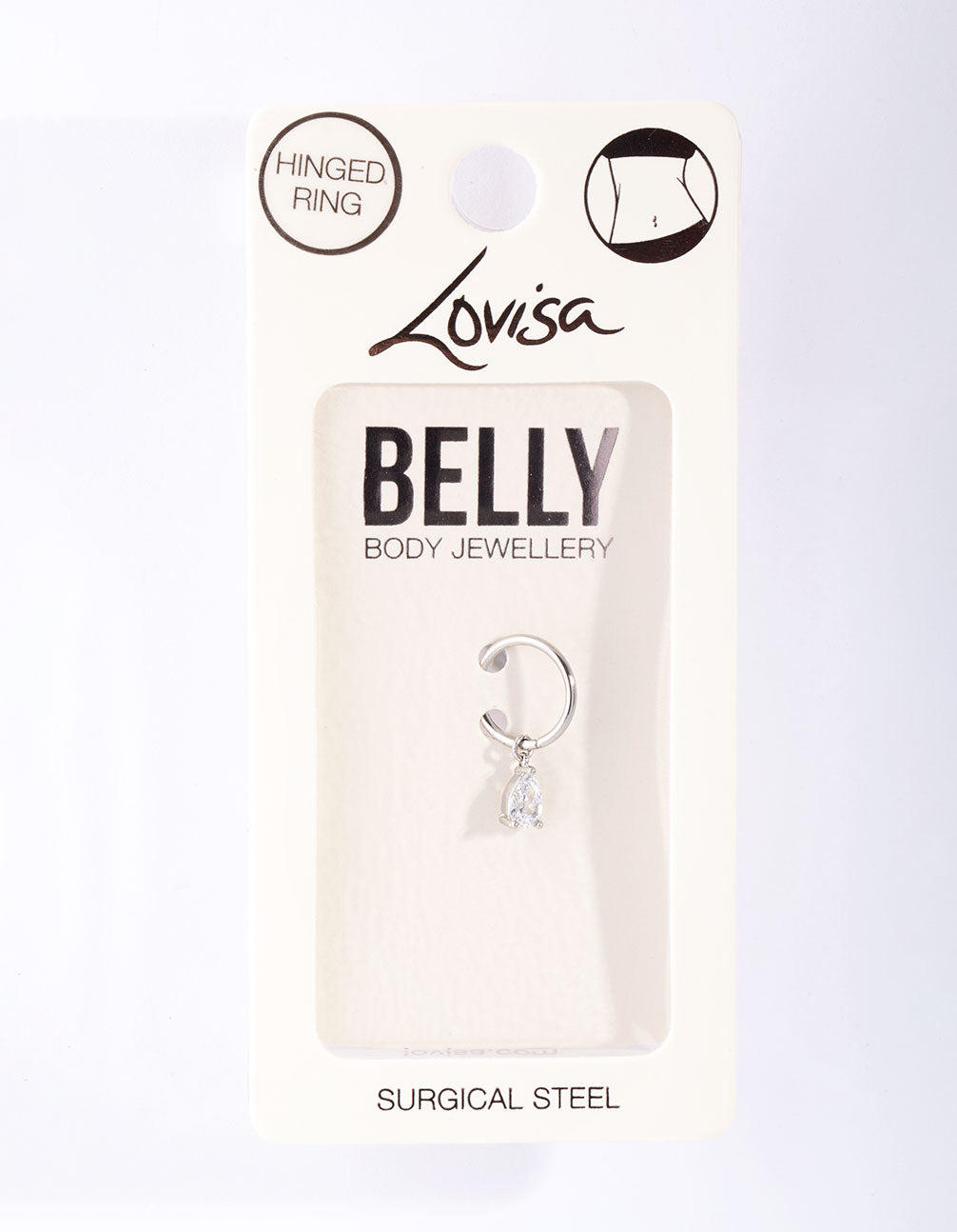 Body jewellery will add some personality to your look. Belly bars and rings are a fun way to show off your style and add something different to your vacation or poolside outfits. This belly jewellery comes with a hinged ring design and a cubic zirconia droplet embellishment. It has a surgical steel post.