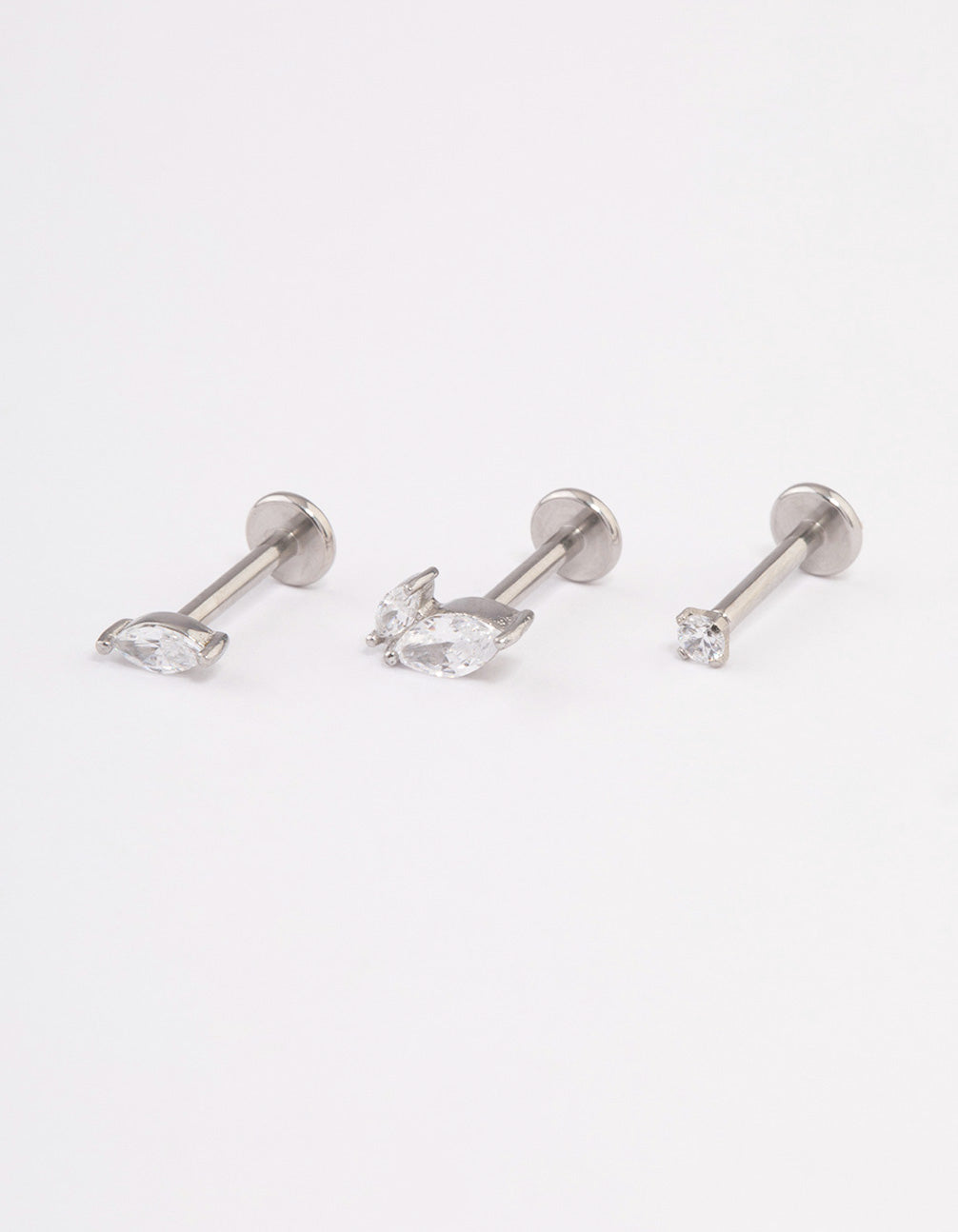 Invest in quality piercing jewellery that's perfect for everyday wear. Crafted from genuine surgical steel, jewellery from our Body Packs Collection are durable and safe for sensitive skin - what's not to love? This pack contains three individual flat backs with a leaf design crafted from cubic zirconia crystals for added interest. Each flatback stud in this pack features a threadless back, for a secure fit and the threadless back also makes it easier for the flat back to be removed.