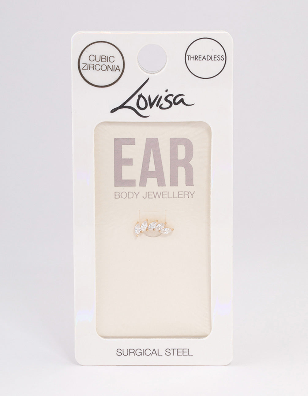 Gold Plated Surgical Steel Cubic Zirconia Leaf Singele Threadless Flat Back Stud