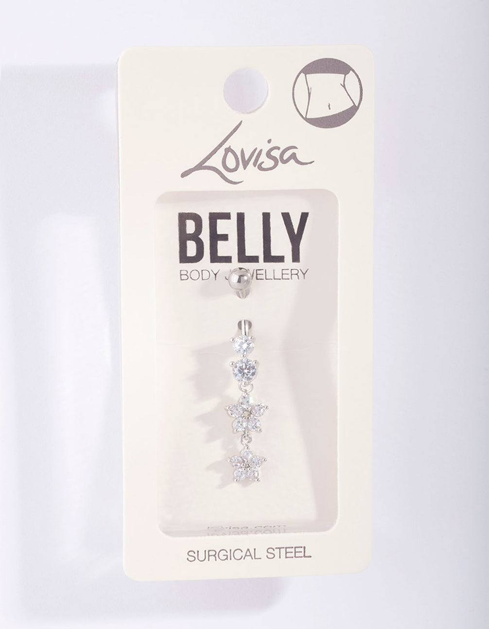 Belly bars and rings are a fun way to show off your style and add something different to your vacation or poolside outfits. This belly bar features a double drop design with a floral motif. It has a surgical steel post, which makes it more gentle for daily use. Check out our cubic zirconia range for accessories to match!