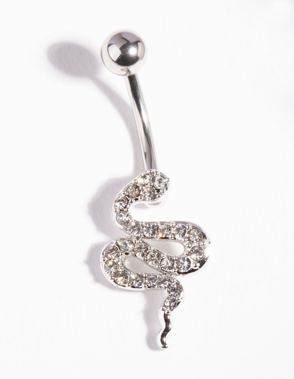 This belly bar is silver toned and features a diamante-encrusted snake. It has a surgical steel post.