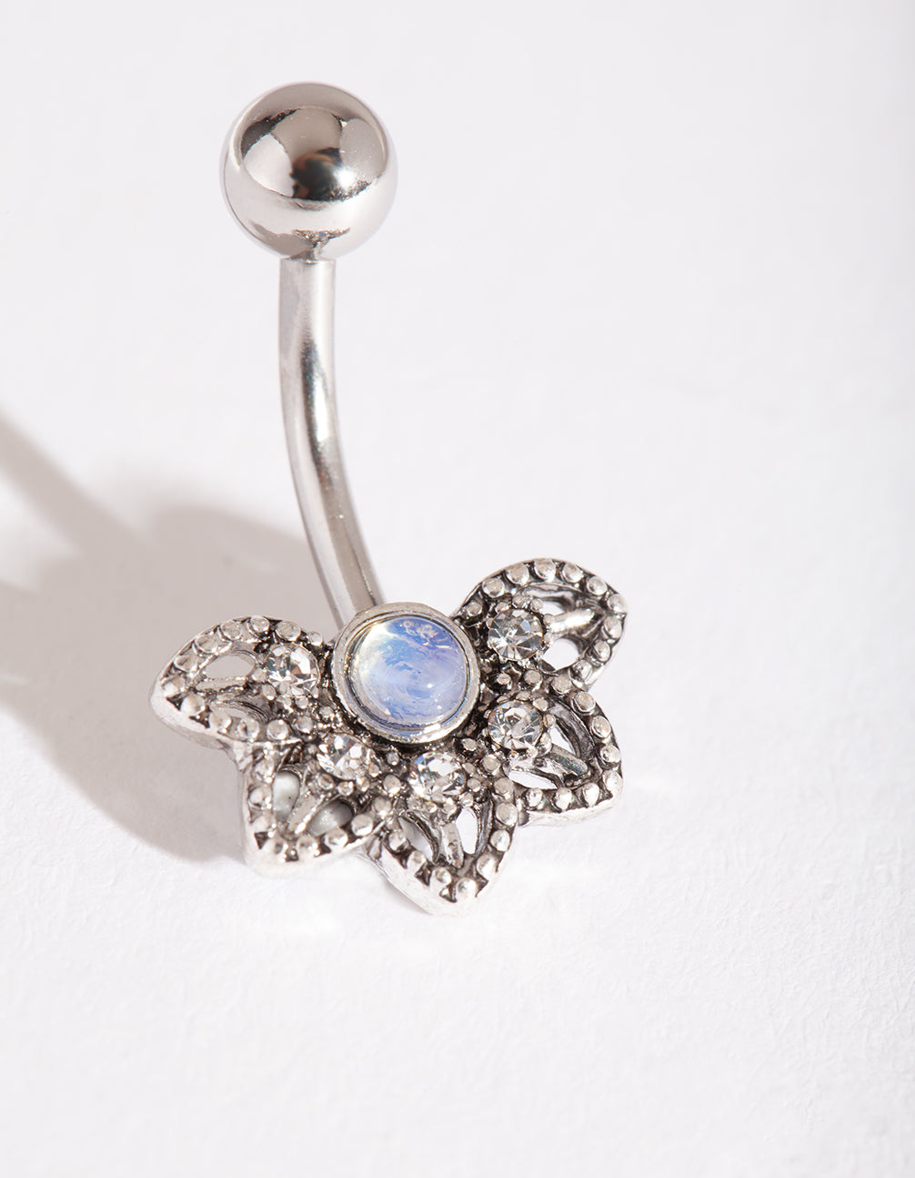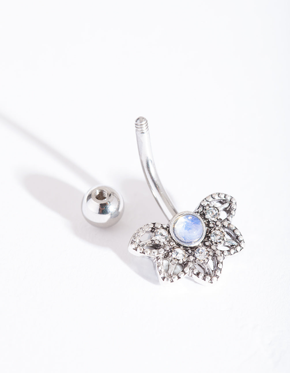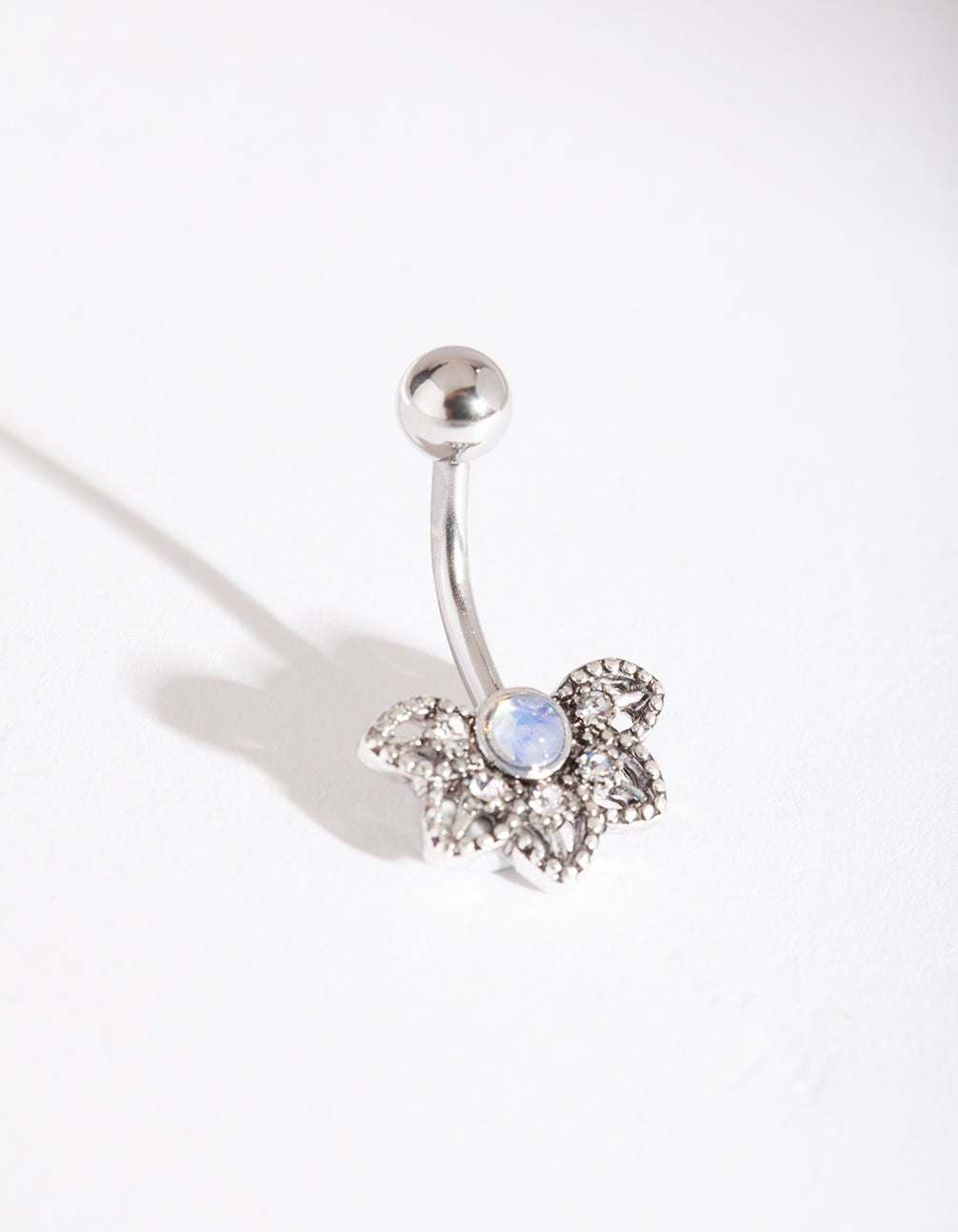 Belly bars and rings are a fun way to show off your style and add something different to your vacation or poolside outfits. This belly bar boasts a silver-toned faux opal flower design. It has a surgical steel post, which makes it more gentle for daily wear. Check out our semi-precious gem collection for dreamy accessories to match!