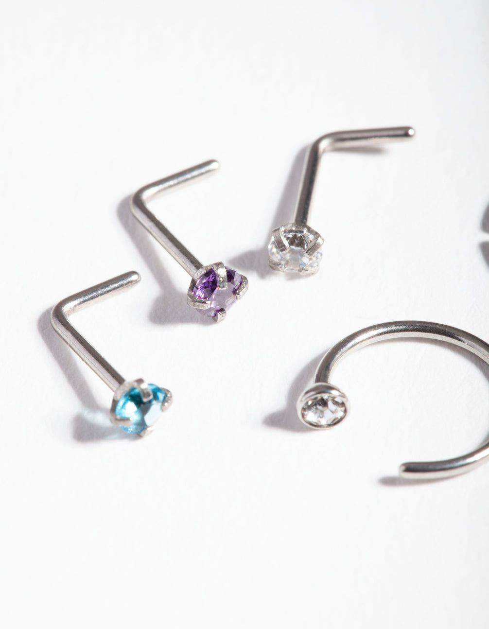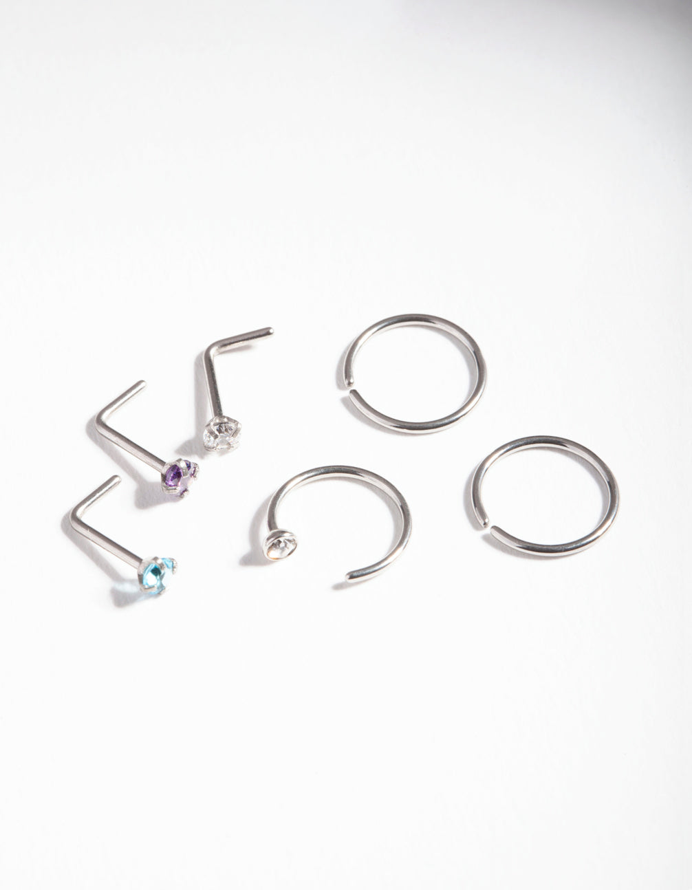 Lovisa body jewellery is made from surgical steel, making it the perfect option for everyday wear. This collection has been made with piercings in mind and features both trend-led and classic styles that you can swap out to suit any occasion. The styles in this pack come with a variety of hooks and studs with small diamante embellishments. Mix and match your nose rings to coordinate with other silver accessories!