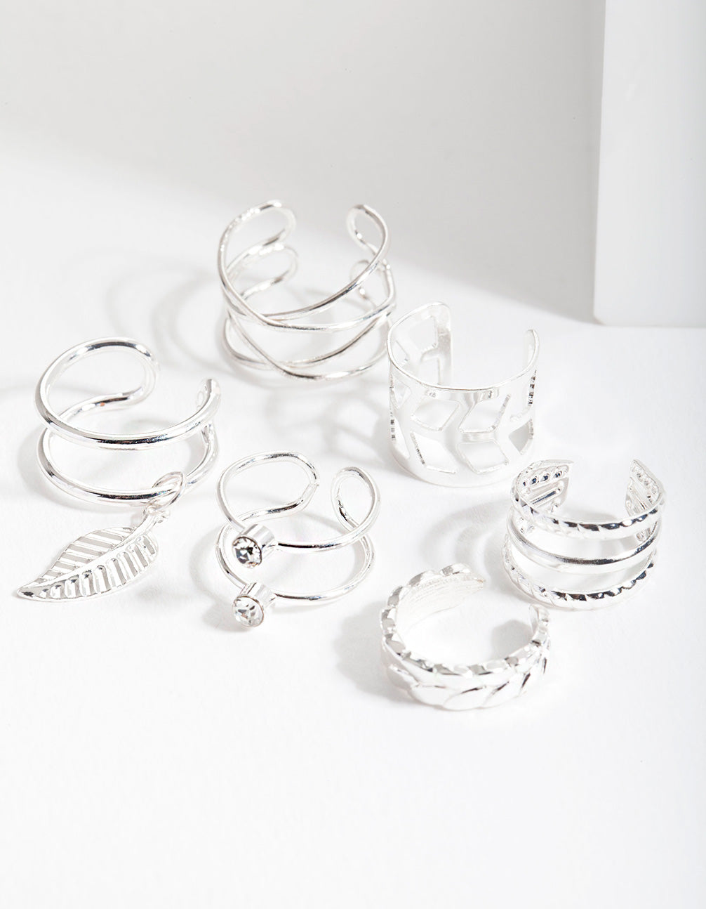 We've done the hard work for you and curated the ultimate stack for your piercings. This style comes with a silver-toned setting and a textured nature-themed motif. Wear this pack scattered across both hands for an on-trend finish to any outfit.