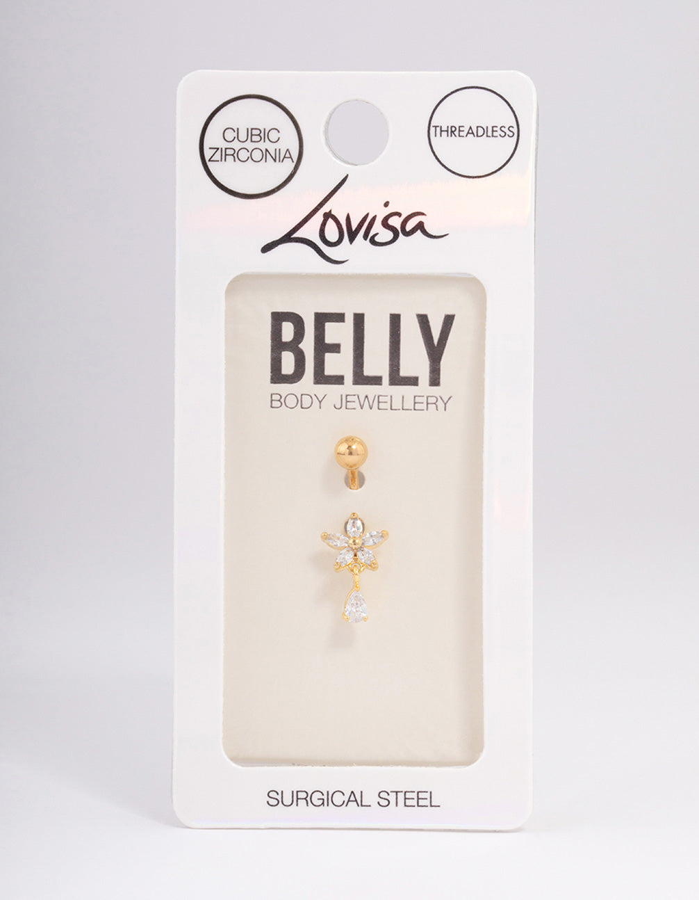 Gold Plated Surgical Steel Cubic Zirconia Flower Pear Threadless Belly Bar