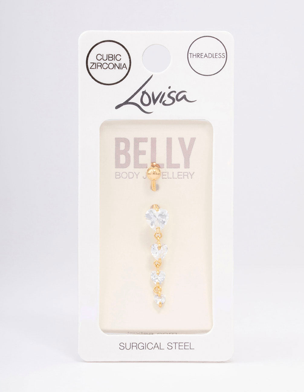 - This belly piercing is plated with real gold and features heart-shaped, cubic zirconia embellishments for added interest. Pair this piercing with matching accessories from our Heart Edit for a lovable look.