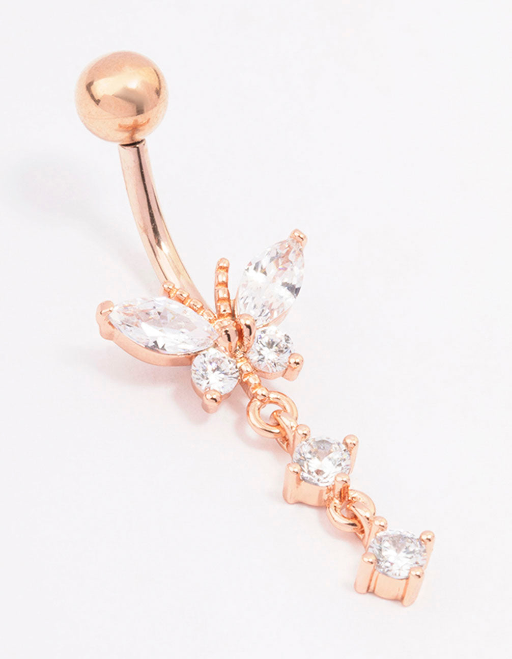 - This belly piercing is plated with real rose gold and features a dainty butterfly charm — perfect for adding interest to your look.