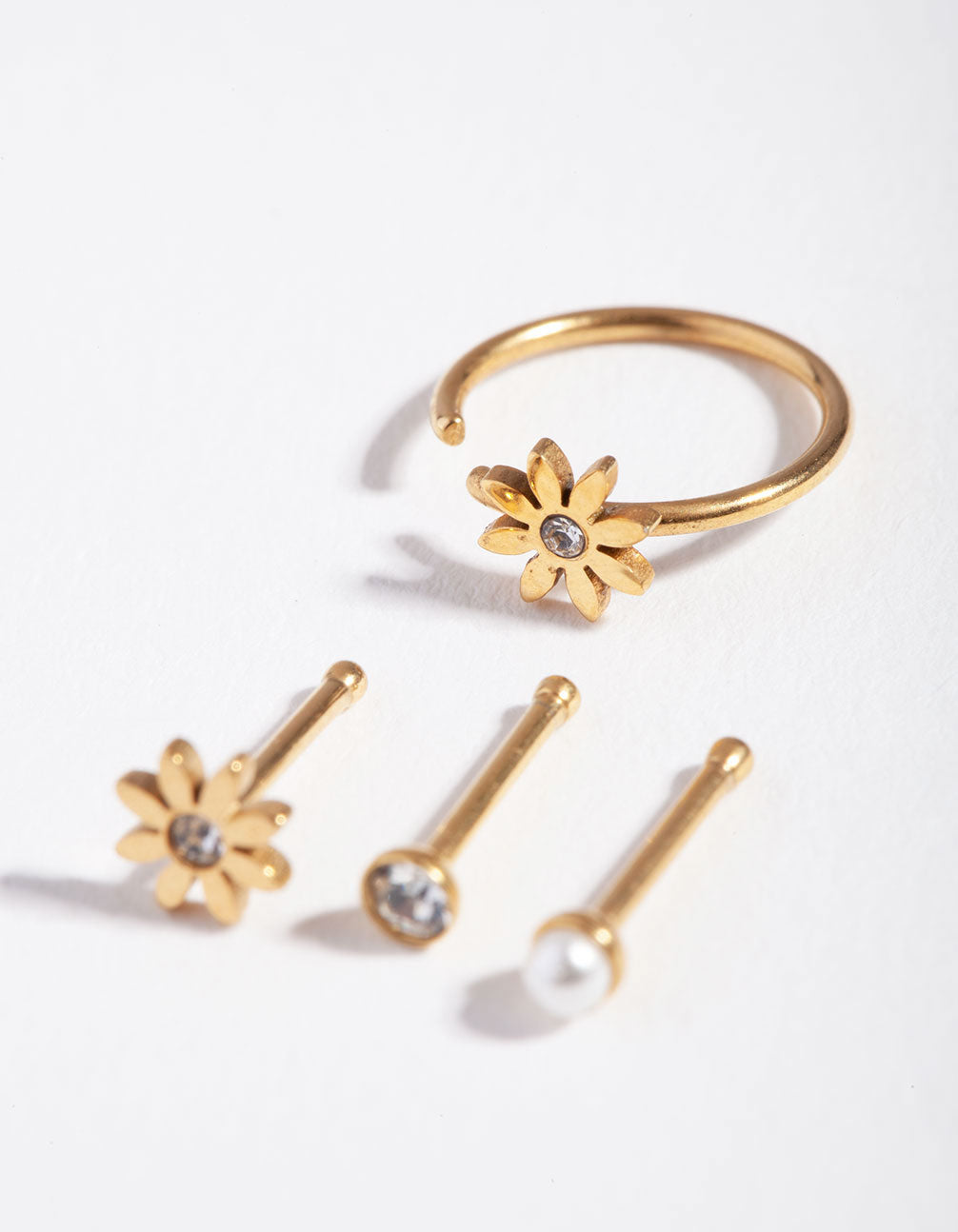 Expand your body jewellery collection with a nose piercing pack! This set includes four gold-toned studs that boast diamante, faux pearl and flower details. They have a gauge of 20 and are 0.8mm in length.