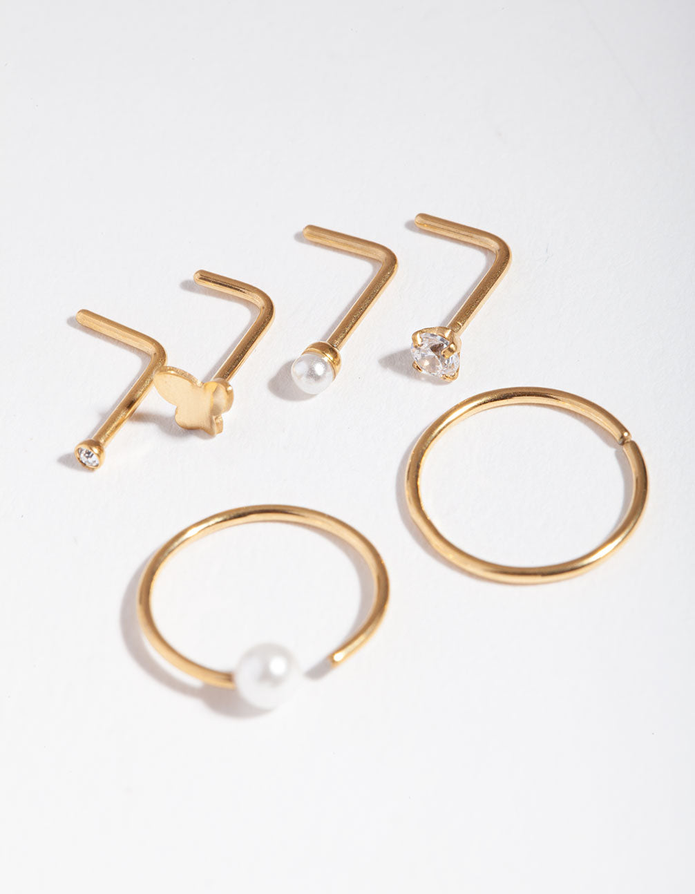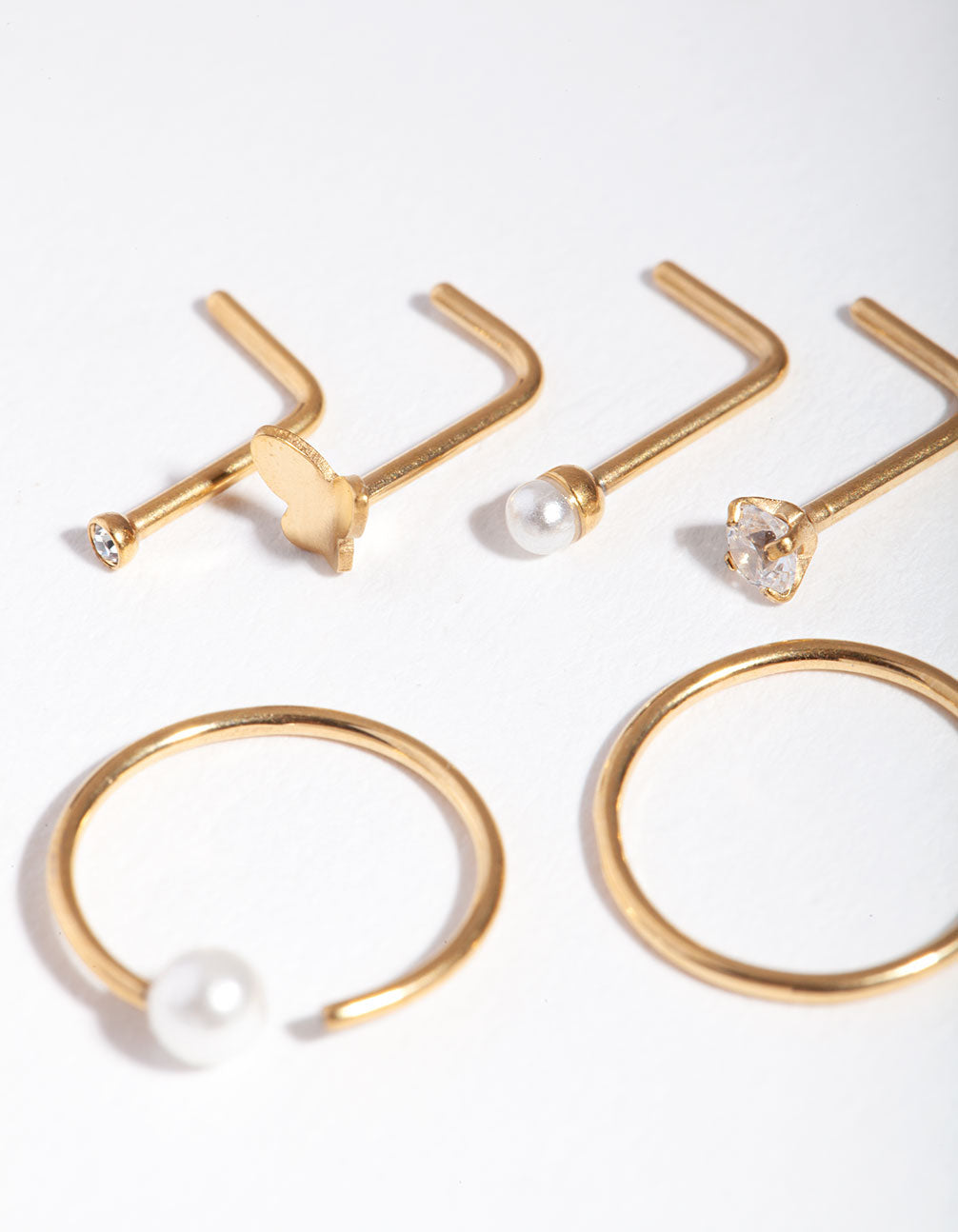 Stack and layer with this curated nose pack! This set includes six gold-toned nose studs and rings, with faux pearl and diamante embellishments. Pair with your favourite gold-toned jewellery for maximum impact! They have a gauge of 20 and are 0.8mm in length.