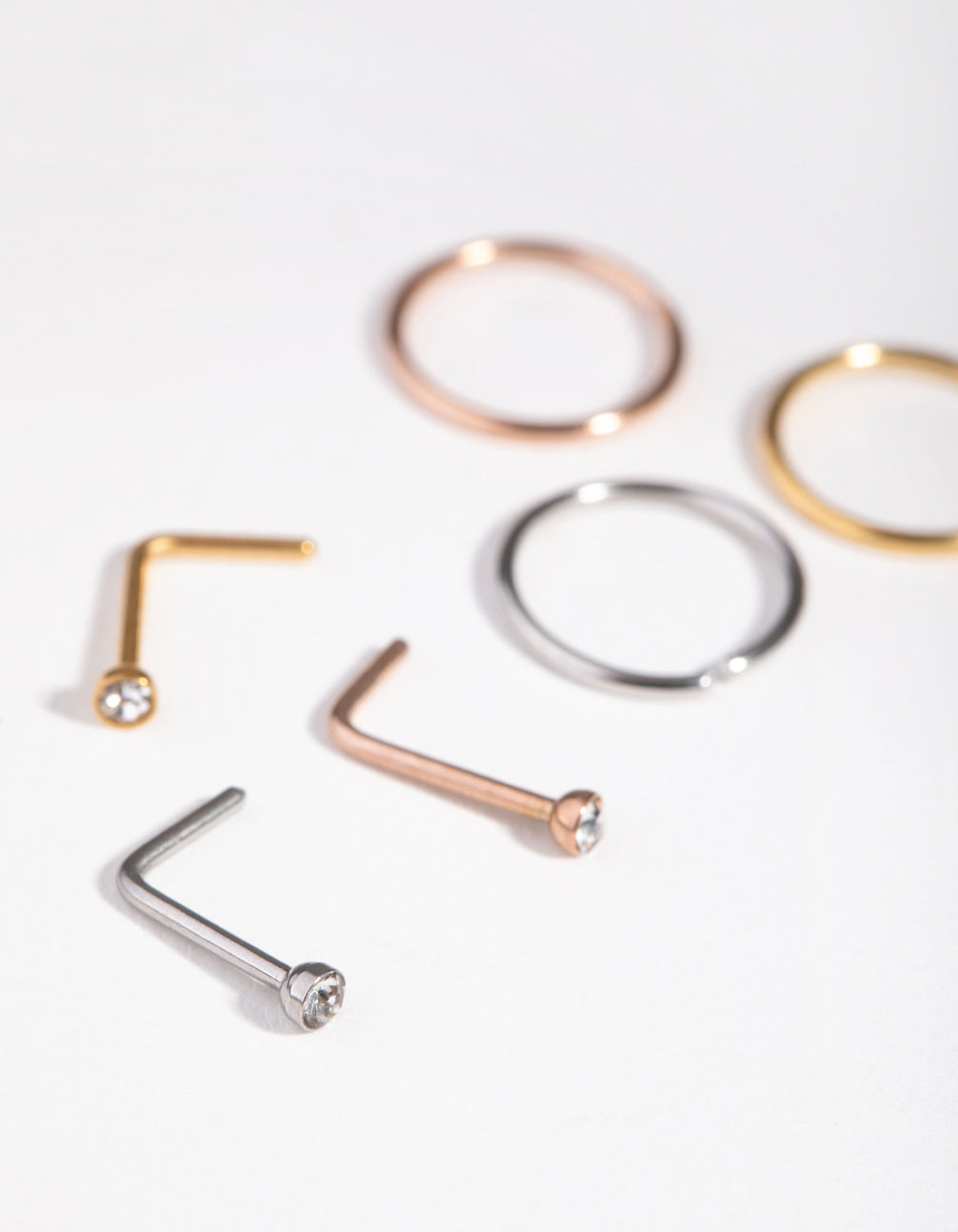 Express your individuality with Lovisa body jewellery! This set includes three rings and three studs designed to be worn in your nose. They come in a mix of silver, gold and rose-gold tones and the studs feature glittering diamantes. They're made from surgical steel so they're gentle on ears. They have a gauge of 20, and a length of 0.8mm.